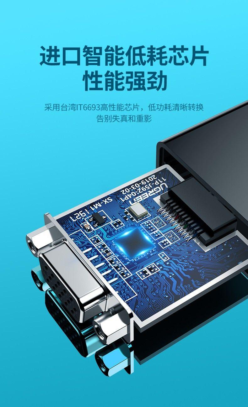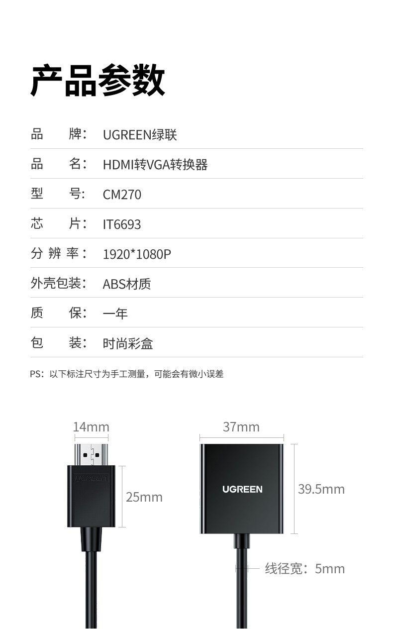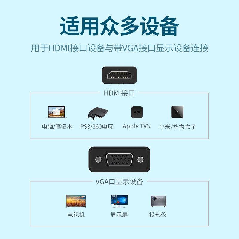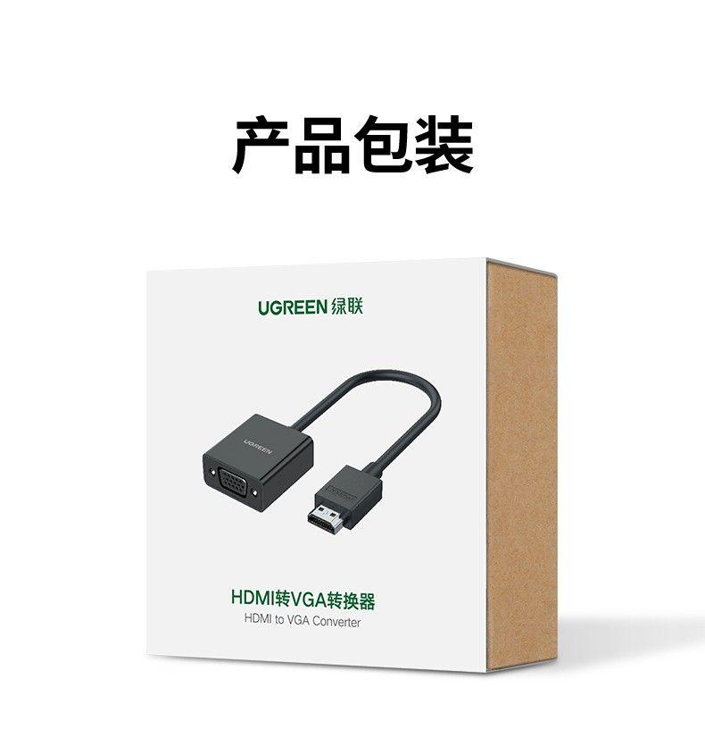 1. Brand: Ugreen 2. Model: 60738 3. Features: connect HDMI port devices to VGA monitors and projectors. 4. Input: HDMI (male) 5. Output: VGA (female) 6. Resolution: FullHD 1920*1080@60Hz 7. Color: Black 8. 248g 9.