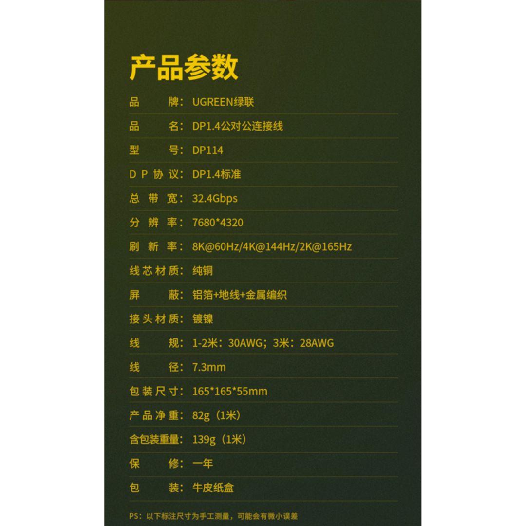 1. Chiều dài : 2m 2. Phiên bản: DP V2.1 3. Tổng băng thông: 80 Gbps 4. Độ phân giải: 16K@30Hz, 10K@60Hz, 8K@120Hz, 4K@144Hz 5. Lõi dây: Đồng nguyên chất 6. Cổng hiển thị UGREEN(DP2.1)