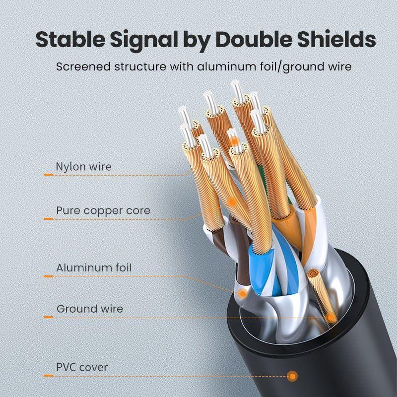 1. Data transfer rate: 10G 2. Frequency: 600MHz 3. 4 shielded twisted pair (U/FTP) of copper wires 4. Pure Copper Core