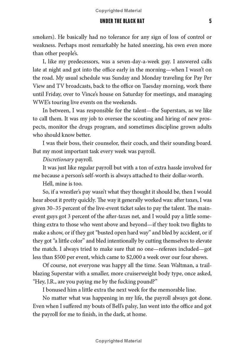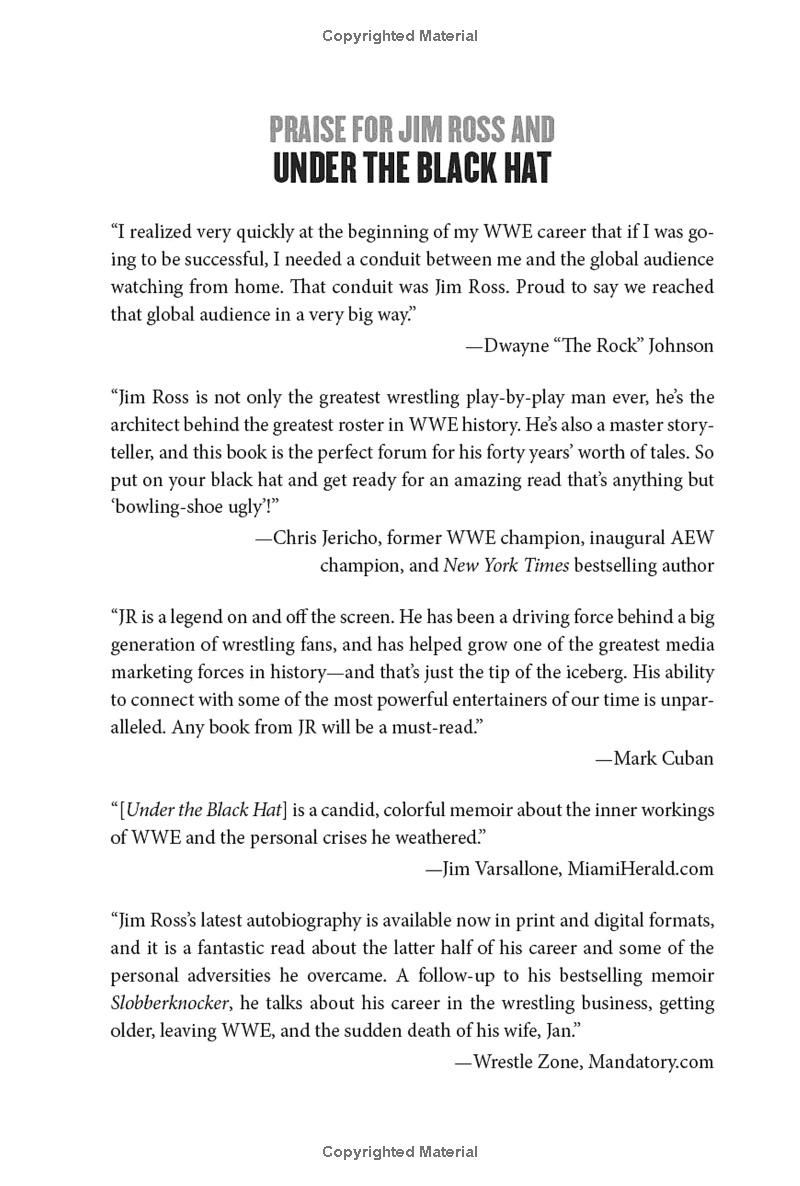 Ross’s ascent in WWE mirrors the rise of professional wrestling itself from a DIY sideshow to a billion-dollar business. Under the Black Hat traces all the highs and lows of that wild ride, in which Jim served not only as on-air commentator, but talent manager, payroll master, and even occasional in-ring foil to threats like Paul “Triple H” Levesque and Undertaker. While his role brought him riches and exposure Jim never dreamed of growing up in a small town in Oklahoma, he chafed against the strictures of a fickle corporate culture and what he saw as a narrow vision of what makes great wrestlers—and great story lines. When suddenly stricken with Bell’s palsy, a form of facial paralysis that makes it impossible to smile, he stared down his greatest fear—being cast out of the announcing booth for good.