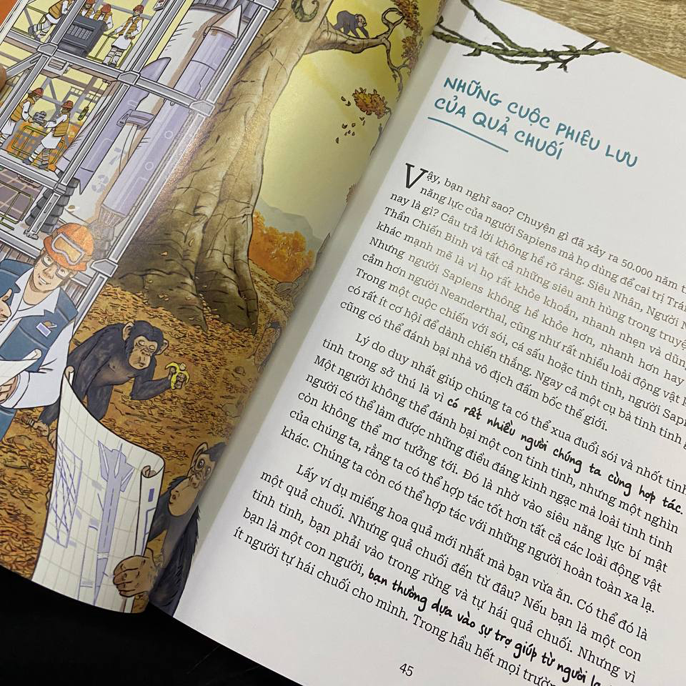 Bộ sách dự kiến gồm 4 tập, được in màu toàn bộ với nhiều tranh minh họa sinh động, đầy màu sắc của Ricard Zaplana Luiz – một họa sĩ người Tây Ban Nha có sở trường vẽ minh họa và vẽ cốt truyện cho các ấn phẩm dành cho thiếu nhi, khiến cho tác phẩm dễ hiểu, hấp dẫn, li kì, hài hước, đưa bạn đọc đi hết từ tò mò này đến tò mò khác, ví dụ như: khám phá nhiều bí ẩn về tổ tiên loài người cũng như rất nhiều động vật khác trên trái đất, từ việc so sánh kích thước não bộ, chế độ ăn uống, sự phát triển chiều cao và giao tiếp với nhau…