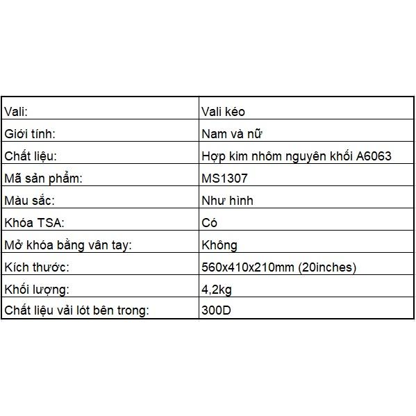 ✨Vali hợp kim nhôm nguyên khối MS1307 Macsim cao cấp màu bạc, màu đen, màu Ti-gold 20inches