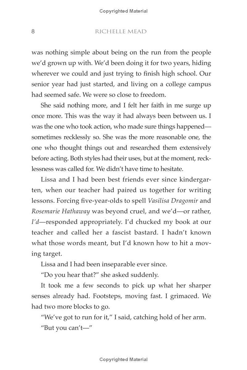 The story that kicked off the international #1 bestselling "Vampire Academy" series is NOW A MAJOR MOTION PICTURE! St. Vladimir s Academy isn t just any boarding school it s a hidden place where vampires are educated in the ways of magic and half-human teens train to protect them. Rose Hathaway is a Dhampir, a bodyguard for her best friend Lissa, a Moroi Vampire Princess. They ve been on the run, but now they re being dragged back to St. Vladimir s the very place where they re most in danger. . . .Rose and Lissa become enmeshed in forbidden romance, the Academy s ruthless social scene, and unspeakable nighttime rituals. But they must be careful lest the Strigoi the world s fiercest and most dangerous vampires make Lissa one of them forever. "