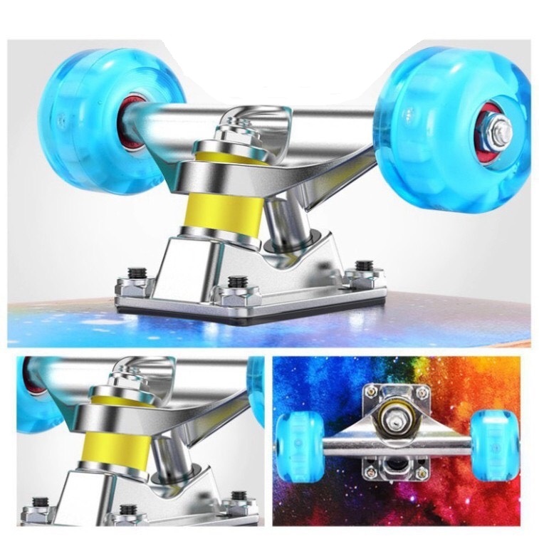 - Phần bánh xe của ván trượt cỡ lớn được bố trí theo vị trí chuẩn xác hỗ trợ bạn thực hiện được nhiều kỹ năng đơn giản như cúi người khi qua một cánh cổng, bật nhảy hay các động tác nâng cao như xoay vòng, lật ván trên không.