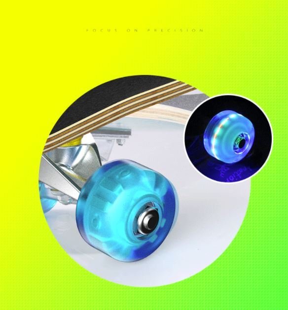- Kết cấu: Mặt ván kết cấu nhám + Bánh cao su có đèn led phát sáng khi chạy.