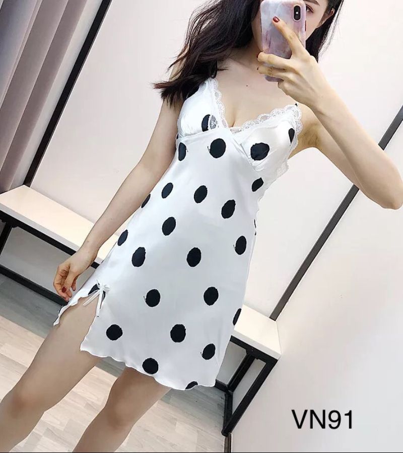 Đầm ngủ lụa thiết kế cao cấp 2 dây chấm bi