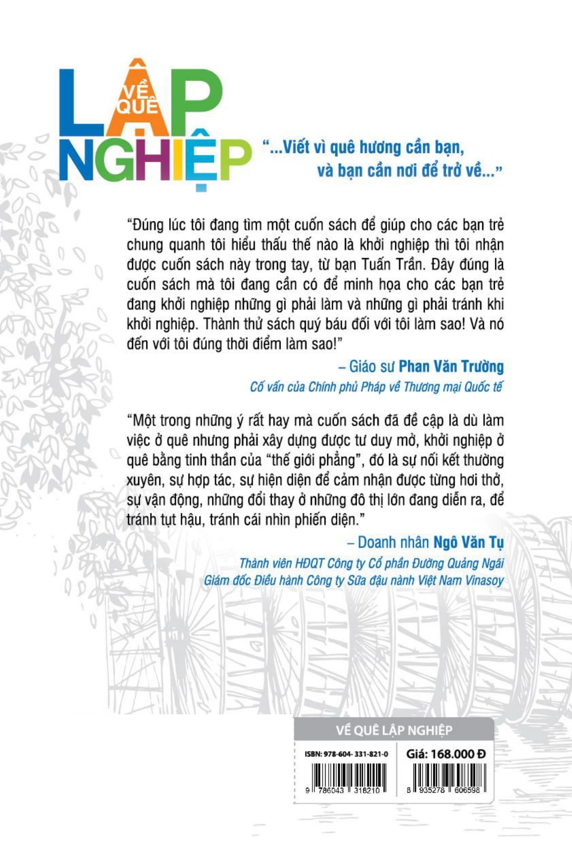 Với Về quê khởi nghiệp, tác giả Tuấn Trần sẽ cho bạn thấy để thành công, bạn cần 1 sự kiên trì bền bỉ. Ngoài ra, bạn cần phải hiểu biết thị trường (đầu ra), có khả năng tụ họp một đội làm việc gắn bó với nhau trong một thời gian dài, khả năng tiếp cận khách hàng, lắng tai nghe từ họ những chỉ trích tích cực hay tiêu cực, khả năng thuyết phục ngân hàng hoặc nhà đầu tư/tài trợ (cho dù người này là cha mẹ hay gia đình). Và đến khi có được hết tất cả những thứ này rồi, bạn lại vẫn cần thêm sự uyển chuyển và khả năng theo dõi gu của thị trường và theo đó mà thích ứng. Rồi nếu tất cả vẫn trôi chảy thuận lợi thì lại còn thêm khả năng quản lý công ty và quản trị nhân viên.