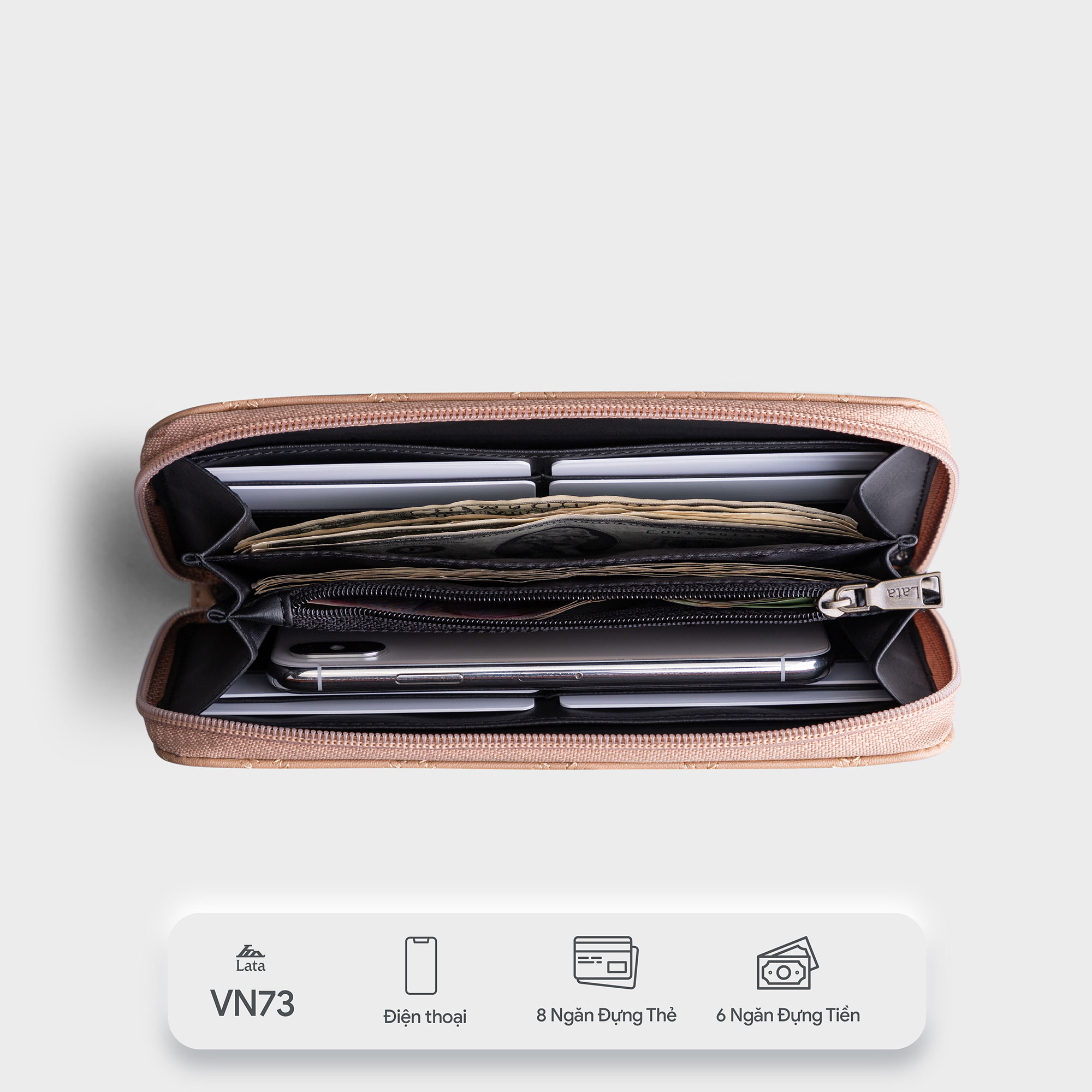 - Chất liệu: da bò cao cấp bền đẹp Sản phẩm có nhiều ngăn tiện lợi cho chị em để được nhiều đồ dùng như điện thoại,giấy tờ,mĩ phẩm và nhiều vật dụng khác… Túi