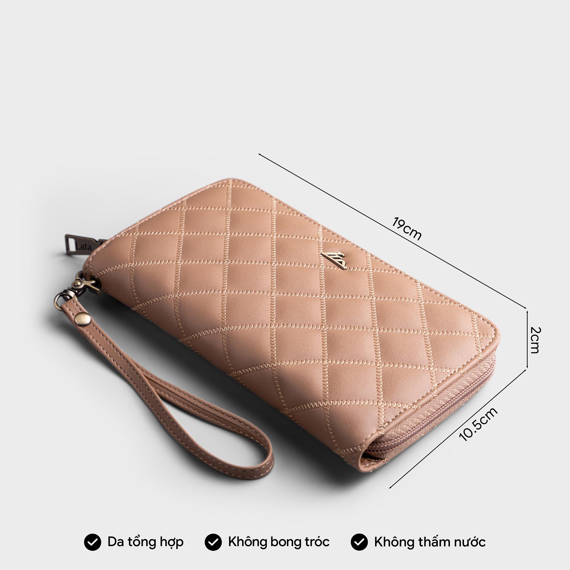 Ví da nữ cầm tay chần bông hình thoi Lata VN73 được thiết kế kiểu dáng lạ mắt, nhưng không kém phần thời trang, sang trọng. Chiếc ví được viền chỉ chắc chắn, bên trong có đầy đủ các ngăn để bạn đựng tiền, điện thoại, và một số vật dụng quan trọng khác. Sản phẩm có thể mang đi làm, đi tiệc, hoặc sử dụng hằng ngày đều phù hợp.