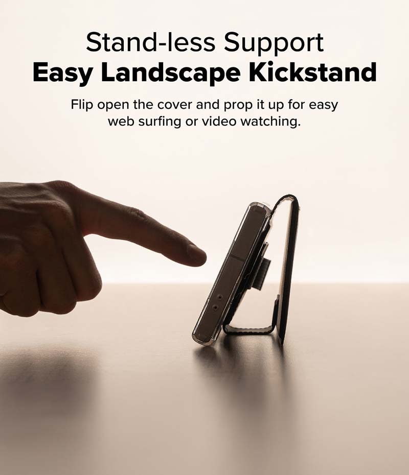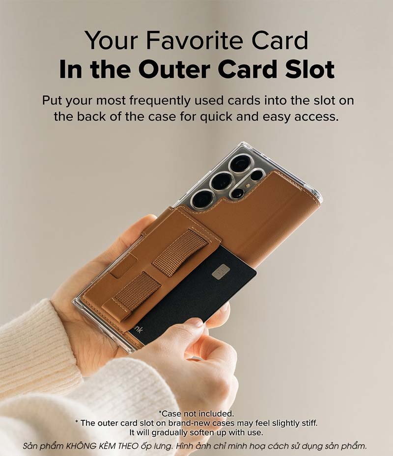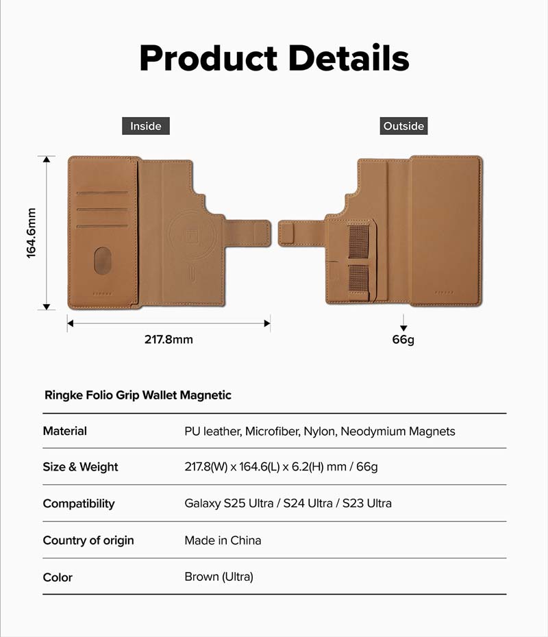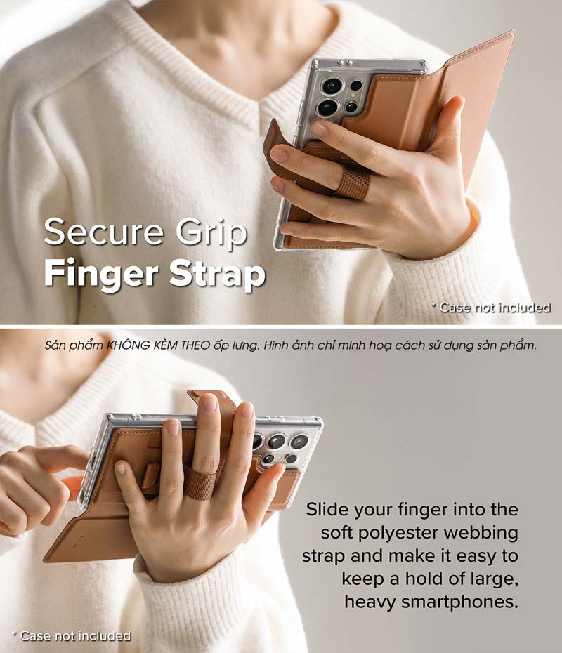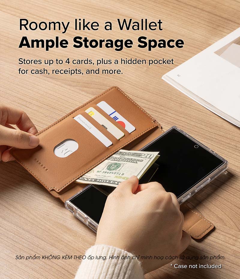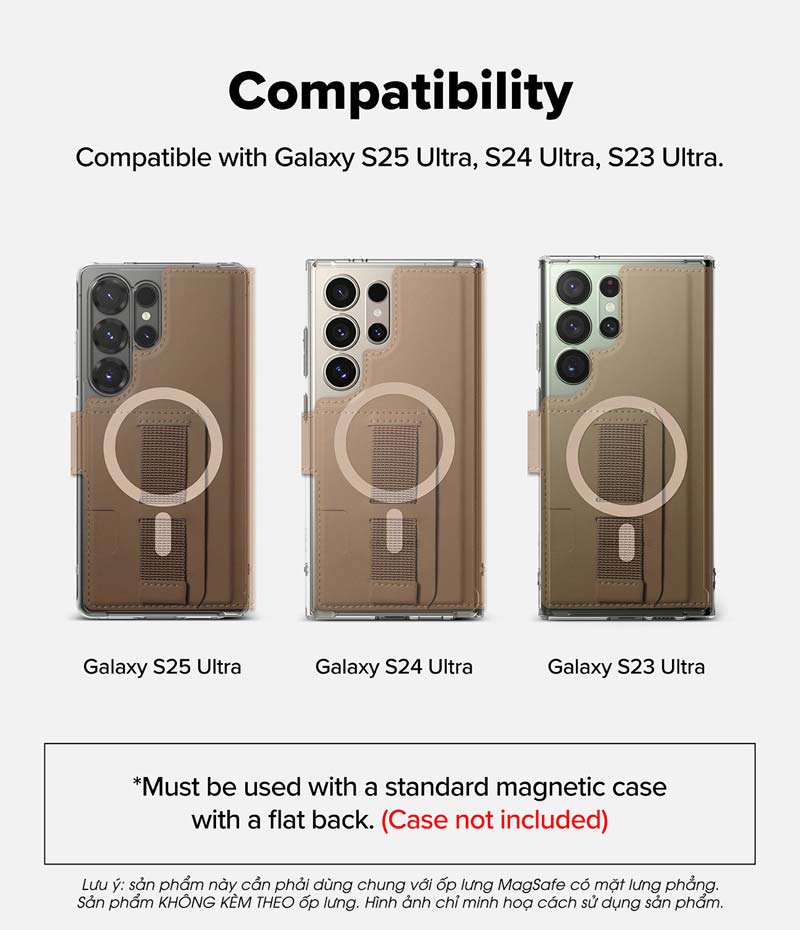 - Ringke Folio Grip Wallet Magnetic là sản phẩm tích hợp 2 tính năng trong một: ví đựng thẻ kiêm giá đỡ và cần được dùng chung với ốp lưng Magnetic dành riêng cho dòng máy Galaxy S25 Ultra/S24 Ultra/S23 Ultra.