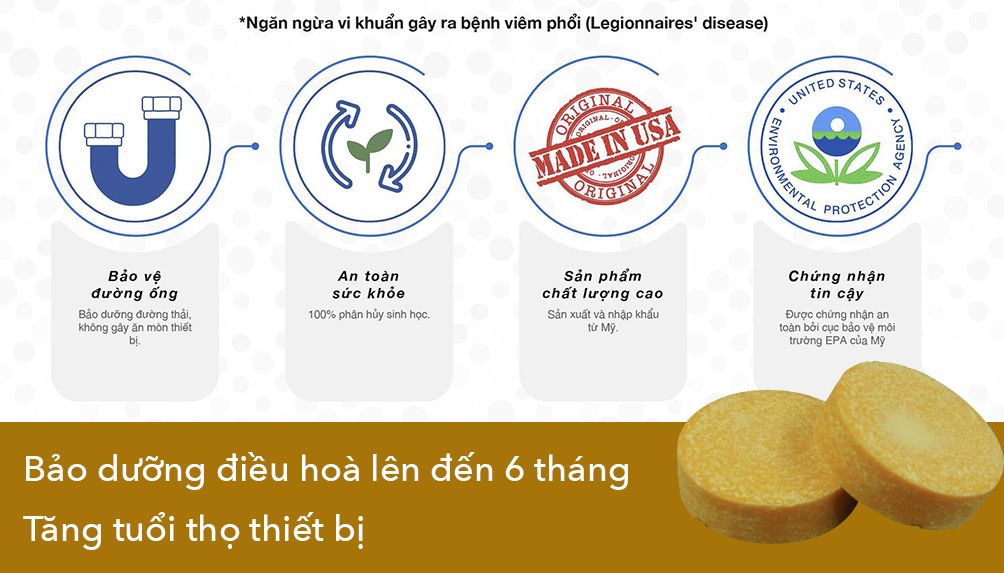 Được sử dụng cho máy điều hòa lên đến 5 tấn. Tất cả các viên nén Pan Gel sẽ nhanh chóng tự khóa vào khay chứa nước và tan dần và hoạt hóa bảo dưỡng đường thải cũng như tạo môi trường không khí trong lành thoát ra từ hệ thống điều hòa. Một lần sử dụng sẽ bảo dưỡng hệ thống điều hòa của bạn đến 6 tháng. Xuất xứ: USA.