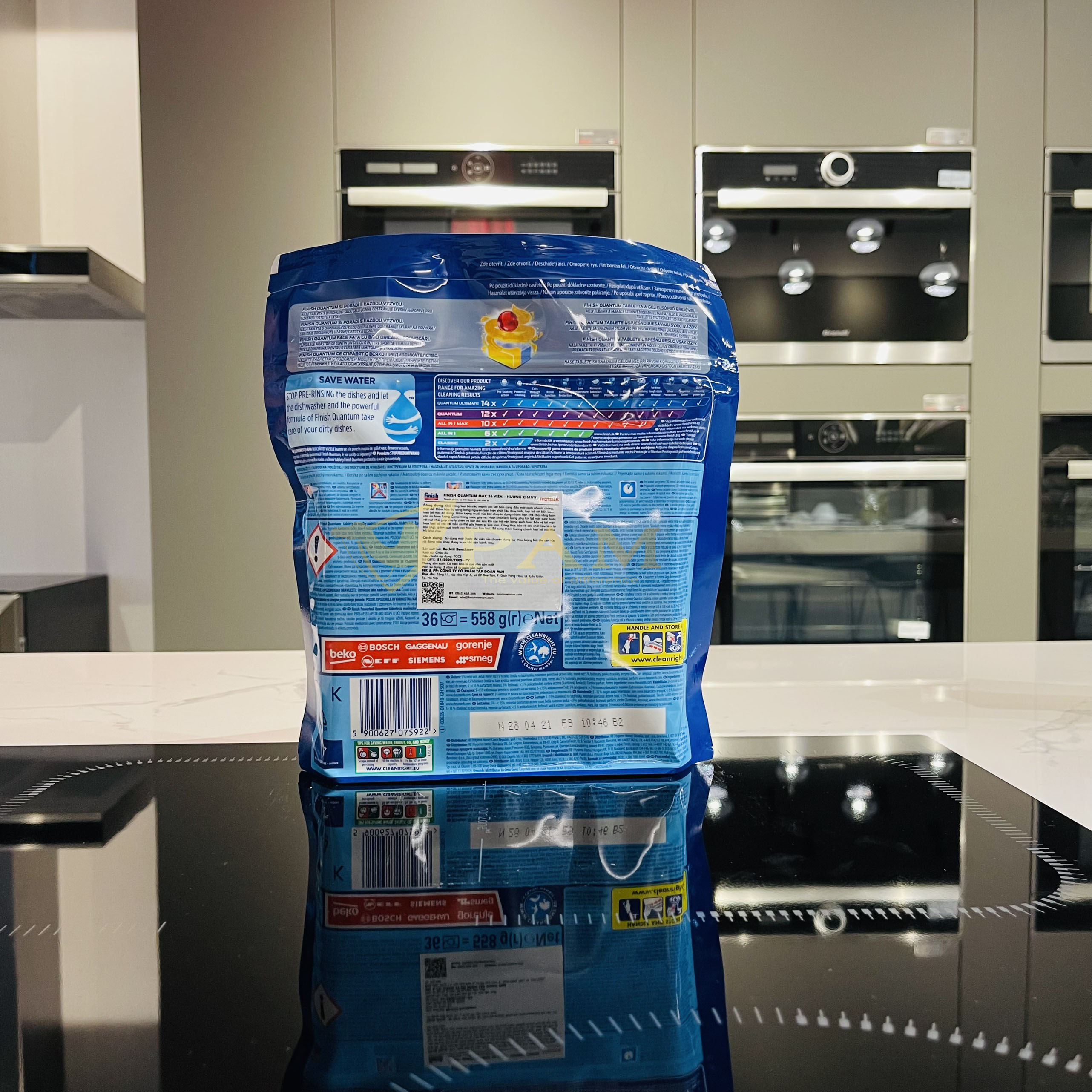 Túi 36 viên rửa chén Finish Quantum Dishwasher Tablets Lime Blast (là viên rửa chén cao cấp chuyên dùng cho máy rửa chén). Xuất xứ: Ba Lan (EU) - Nhà sản xuất: Reckitt Benckiser -