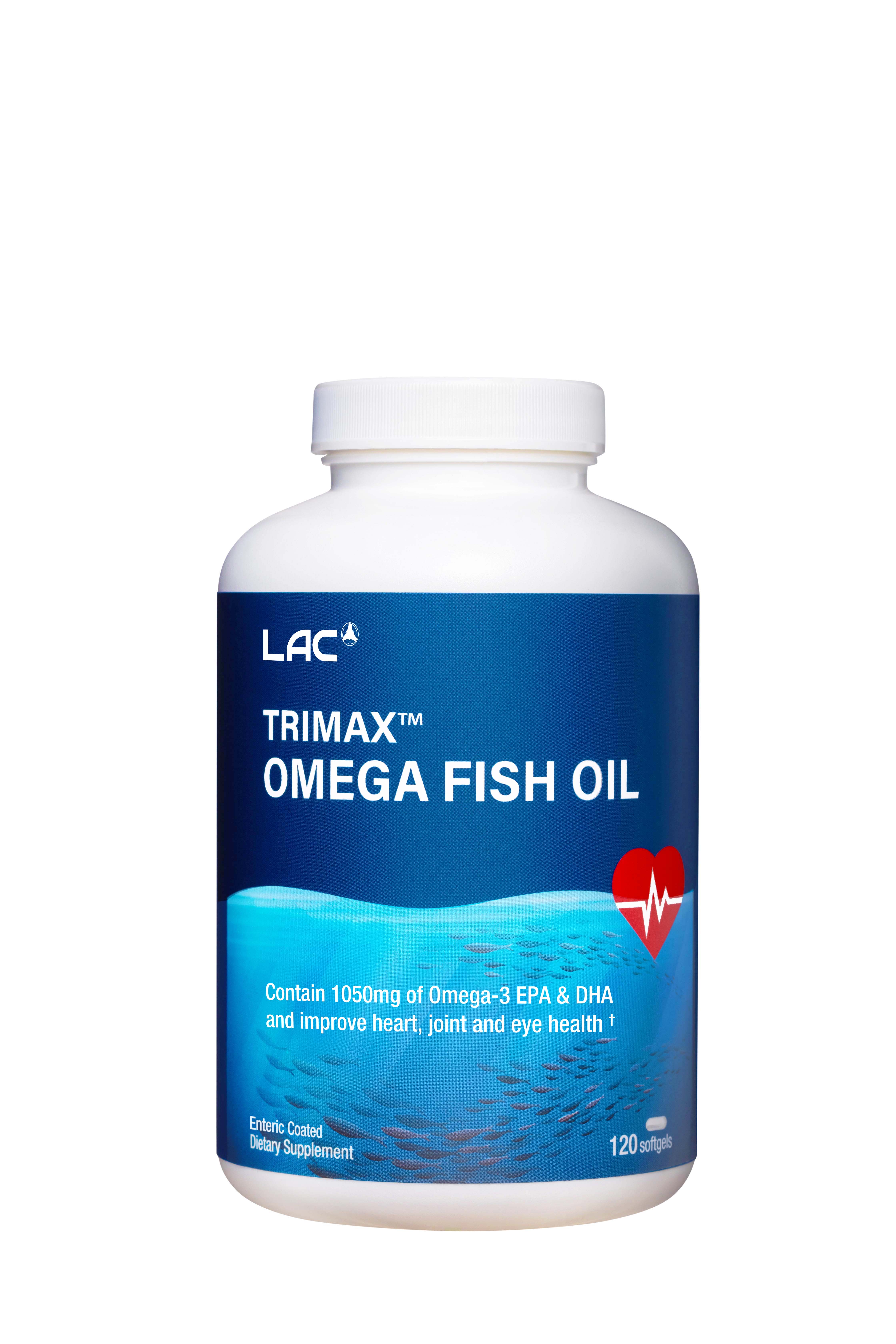 Mua tại TiktokVIÊN UỐNG DẦU CÁ BỔ SUNG OMEGA HỖ TRỢ TIM MẠCH LAC TRIMAX OMEGA FISH OIL (120 VIÊN) chứa hàm lượng axit béo Omega-3 gấp 3 lần so với dầu cá thông thường giúp hỗ trợ tim mạch, tăng cường chức năng não và phục hồi sức khỏe khớp. THÔNG TIN SẢN PHẨM Đặc tính nổi bật Viên nang mềm LAC Trimax Omega Fish Oil được phủ lớp bảo vệ dạ dày để giảm khả năng gây ra cảm giác buồn nôn từ mùi tanh của dầu cá. Dầu cá được tinh chế, phù hợp sử dụng dài hạn mà không cần lo lắng về các kim loại nặng có hại có thể có trong một số loại cá ngày nay Công dụng