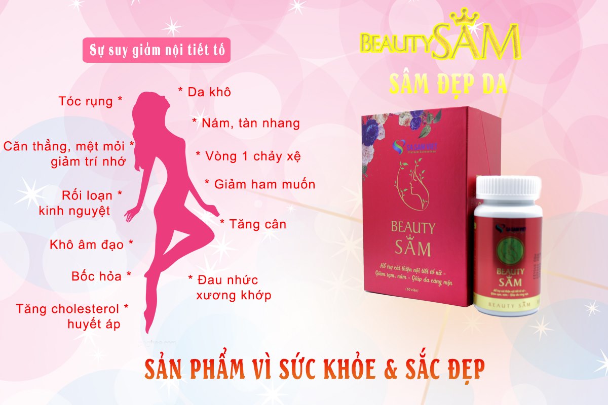 - Giảm nồng độ cholesterol trong máu, chống cao huyết áp. Quy cách dóng gói: 60viên/ lọ/ hộp. Thời hạn sử dụng sản phẩm: 36 tháng kể từ ngày sản xuất, ngày sản xuất ghi trên nhãn sản phẩm. Về Sa Sâm Việt Doanh nghiệp đầu tiên tại Việt Nam và trên Thế Giới trồng sâm trên cát biển Nghiên cứu được đăng trên tạp chí khoa học Thế Giới Một giải pháp vô cùng an toàn và hiệu quả 100% từ thiên nhiên SÂM ĐẸP DA (BeautySAM), như một cách chăm sóc da hiệu quả và đỡ tốn kém nhất với những chị em đã từng sử dụng nhiều loại mỹ phẩm, làn da có dấu hiệu lão hóa do tuổi tác,… Với những dược chất từ Saponin, Polyphenol, Diệp lục tố, Vitamin,… sẽ mang đến những tác dụng diệu kỳ cho làn da của bạn. Da bạn sẽ sáng bóng, nhẵn mịn, hồng hào từ bên trong một cách tự nhiên. Cấu trúc da trở nên khỏe mạnh và liên kết tốt làm se khít các lỗ chân lông. Viên uống Sâm Đẹp Da (BeautySAM) là đề tài nghiên cứu khoa học từ Sa Sâm Việt được chiếc xuất cùng với dược liệu quý thiên nhiên của Việt Nam như: Mầm đậu nành, Trinh nữ hoàng cung, Bồ công anh, Lô hội…bào chế tạo thành. Viên uống Sâm Đẹp Da (BeautySAM) hỗ trợ giúp nâng cao thể trạng, thải độc và thanh lọc cơ thể, giải quyết các nguyên nhân và triệu chứng như: Hỗ trợ cải thiện nội tiết tố nữ, thanh nhiệt, giải độc, giảm sạm da giúp da căng sáng, trẻ mịn màng... Nguyên nhân gây tổn hai cho da: Yếu tố tâm lý đây là yếu tố tưởng chừng như không ảnh hưởng gì tới làn da có ảnh hưởng rất lớn tới vẻ bề ngoài và sức khỏe làn da. Tâm lý thoải mái, thư giãn sẽ đẩy nhanh quá trình tuần hoàn máu dưới da, tăng cường khả năng loại bỏ tế bào chết và sản sinh ra các tế bào mới, giúp làn da mịn màng và có độ đàn hồi cao. Ngược lại, nếu thường xuyên ở trong tình trạng u uất, sẽ gây rối loạn nội tiết trong cơ thể, làm rối loạn sắc tố da và làm giảm khả năng miễn dịch của da ngoài ra yếu tố sức khỏe, tuổi tác, thói quen sinh hoạt, môi trường làm việc, mất ngủ... sẽ làm giảm khả năng tái tạo tế bào da mới, da trở nên thô ráp, mắt dễ bị thâm quầng sẽ là kẻ thù lấy đi sự tươi trẻ cho làn da của mình. Những dấu hiệu nhận biết khi da có vấn đề: Làn da trông xỉn màu, da bong tróc và thô ráp, nổi mụn và mệt mỏi, nám, tàn nhan, cảm giác căng rát, ngứa ngáy... Theo như bác sĩ da liễu Debra Jaliman tại New York, Mỹ: "Làn da khô không gây ra nếp nhăn nhưng chúng sẽ khiến gương mặt trông già đi và các nếp nhăn thì lộ rõ hơn, mỗi khi lớp màng bảo vệ da bị tổn thương do thiếu đi độ ẩm thì làn da cũng dễ nổi mụn hơn". Rối loạn nội tiết tố nữ: Nguyên nhân, dấu hiệu và cách hỗ trợ điều trị Tổng quan bệnh Rối loạn nội tiết tố Hệ thống nội tiết được xem như “nhạc trưởng” của cơ thể, bao gồm một mạng lưới các tuyến sản xuất và giải phóng hormone, giúp kiểm soát nhiều chức năng quan trọng, đặc biệt là khả năng chuyển hóa năng lượng giúp các tế bào và cơ quan vận hành. Hoạt động của hệ thống này ảnh hưởng đến sự tăng trưởng và phát triển, trao đổi chất, chức năng tình dục và tâm trạng của cơ thể. Các tuyến nội tiết chính của cơ thể bao gồm: • Vùng dưới đồi: Vùng này có mối liên hệ mật thiết qua đường mạch máu và đường thần kinh với tuyến yên. Các hormon do vùng dưới đồi bài tiết sẽ theo những con đường này đến dự trữ hoặc tác động (kích thích hoặc ức chế) đến chức năng của tuyến yên. Các hormon do tuyến này tiết bao gồm TSH - TRH, ACTH – CRH, FSH và LH-GnRH, Prolactin – PIH, ADH, oxytocin. • Tuyến yên: Nằm ở đáy não đằng sau các xoang, nó còn được gọi là “tuyến chủ” bởi vì nó ảnh hưởng nhiều đến các tuyến khác, đặc biệt là tuyến giáp. Tuyến yên gồm các hormon GH, Prolactin, ACTH, TSH, FSH, LH, Lipoprotein...Tùy thuộc vào từng loại hormon mà tuyến yên có các chức năng khác nhau như quyết định sự tăng trưởng của cơ thể (GH), sự tăng trưởng và phát triển các tuyến sinh dục (LH, FSH). • Tuyến tùng: tuyến này nằm gần trung tâm của não bộ và có thể sản xuất các nội tiết tố điều khiển giấc ngủ. • Tuyến giáp trạng: nằm ở hai bên và phía trước khí quản, ngay dưới thanh quản. Hai hormon quan trọng của tuyến giáp là T3 (Triiodothyronine) và T4 (Tetraiodothyronine). Chức năng của tuyến giáp là điều hòa sự trao đổi chất. • Tuyến cận giáp: nằm ngay sau tuyến giáp, hormon tuyến cận giáp là Parahormon – PTH, có tác dụng lên xương, thận, ruột,… của cơ thể. • Tuyến ức: nằm trong lồng ngực, phía sau xương ức, là cơ quan quan trọng tạo hệ miễn dịch, giúp tế bào miễn dịch lympho T từ dạng tế bào non thành tế bào trưởng thành và có chức năng miễn dịch. • Tuyến tụy: nằm sau phúc mạc, thực hiện cả chức năng nội tiết và ngoại tiết. • Tuyến thượng thận: nằm phía trên của hai quả thận, tiết ra các hormone giúp cân bằng cơ thể. Tuy