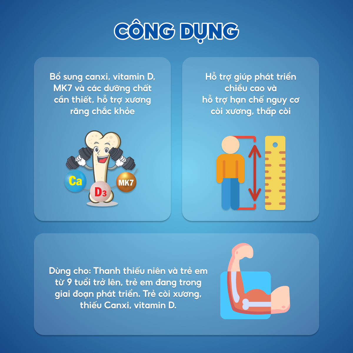 CÔNG DỤNG - Bổ sung canxi, vitamin D3 cho cơ thể, giúp phòng chống loãng xương, hạ canxi máu, thiếu canxi mạn tính, phát triển chiều cao. - Tăng mật độ xương, giúp xương, răng,