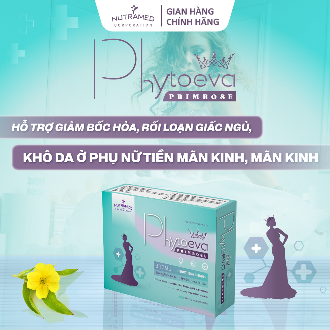 PHYTOEVA PRIMROSE - GIẢI PHÁP TĂNG CƯỜNG S.INH L.Ý VÀ SẮC ĐẸ, GIÚP CÂN BẰNG VÀ ỔN ĐỊNH NỘI TIẾT TỐ CHO PHỤ NỮ   THÀNH PHẦN  ️ Dầu Hoa anh thảo (Evening Primrose oil); Cao khô Thiên môn chùm (Asparagus racemosus extract); Cao khô Thiên ma (Actaea racemosa extract); Cao khô Maca (Lepidium meyenii extract); Cao khô Trinh nữ (Vitex agnus-castus extract); Cao khô Đương quy (Angelica sinensis extract); Vitamin E (DL-alpha tocopheryl acetate); Bột Nhau thai cừu (Sheep placenta powder); Bột Sữa ong chúa (Royal jelly powder)   CÔNG DỤNG: ️ Hỗ trợ giảm triệu chứng bốc hỏa, rối loạn giấc ngủ, khô da ở phụ nữ tiền mãn kinh, mãn kinh   ĐỐI TƯỢNG SỬ DỤNG ️ Phụ nữ trong thời kỳ mãn kinh, tiền mãn kinh   HƯỚNG DẪN SỬ DỤNG ️ Ngày uống 1 lần, mỗi lần 1 viên, uống sau khi ăn 2h   KHÔNG SỬ DỤNG TRONG CÁC TRƯỜNG HỢP ️ Phụ nữ có thai và cho con bú ️ Người mẫn cảm, kiêng kỵ với bất kì thành phần nào của sản phẩm   BẢO QUẢN ️ Để nơi khô ráo, nhiệt độ dưới 30°C tránh ánh nắng mặt trời ️ Để xa tầm tay trẻ em   LƯU Ý ️ Người đang dùng thuốc hỏi ý kiến của chuyên gia y tế trước khi dùng ️ Sản phẩm này không phải là thuốc và không có tác dụng thay thế thuốc chữa bệnh   THÔNG TIN SẢN PHẨM Tên sản phẩm: Phytoeva Primrose Quy cách: Hộp 30 viên nang mềm Hạn sử dụng: 3 năm từ ngày sản xuất Tiêu chuẩn: TCCS   Nutramed - Khơi Nguồn Khoa Học Tới Cuộc Sống Nhà máy đạt chuẩn WHO – GMP, nguyên liệu kiểm tra chất lượng nghiêm ngặt, đảm bảo an toàn và hiệu quả.