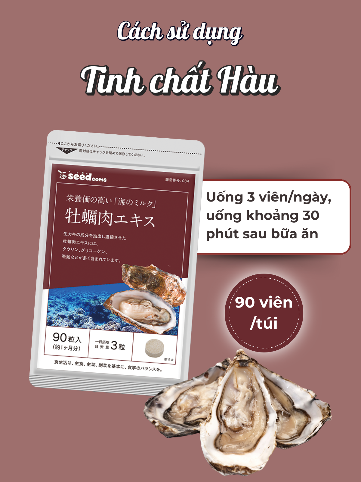 Viên uống tinh chất hàu Seedcoms Nhật Bản là sản phẩm được chiết xuất từ tinh chất hàu tự nhiên, được xử lý để loại bỏ kim loại nặng, đồng thời giữ nguyên vẹn những dưỡng chất quý giá có trong tinh hàu biển mang đến nhiều hiệu quả hỗ trợ tích cực cho sức khỏe nam giới. THÀNH PHẦN CỦA VIÊN UỐNG TINH CHẤT HÀU: Mạch nha(sản xuất tại Thái Lan) Thực phẩm chế biến từ hàu (chiết xuất thịt hàu, dextrin) Lactose (bao gồm cả thành phần sữa)/cellulose tinh thể Chất nhũ hóa Taurine (chiết xuất). CÔNG DỤNG CỦA VIÊN UỐNG TINH CHẤT HÀU:  Bổ sung dinh dưỡng, vitamin và khoáng chất từ Hàu Hỗ trợ duy trì chức năng sinh lý Tăng cường sức khỏe, giảm mệt mỏi Hỗ trợ chức năng gan .   ĐỐI TƯỢNG SỬ DỤNG CỦA VIÊN UỐNG TINH CHẤT HÀU: Người cần bổ sung dinh dưỡng và khoáng chất từ hàu Người trưởng thành cần tăng cường sinh lý và sức khỏe.   QUY CÁCH & HDSD SẢN PHẨM: Số lượng viên/gói: 90 viên/gói Hạn dùng: hạn sử dụng được in trên bao bì sản phẩm. Liều lượng: Uống 3 viên/ngày, uống khoảng 30 phút sau bữa ăn.   LƯU Ý KHI SỬ DỤNG: Không dùng cho người bị dị ứng với thành phần của sản phẩm. Dừng sử dụng sản phẩm nếu cơ thể có bất kỳ phản ứng bất thường nào. Người đang mang thai, cho con bú cần tham khảo ý kiến của bác sỹ trước khi sử dụng. Tránh xa tầm với của trẻ nhỏ. Tránh ăn nhầm gói hút ẩm có trong sản phẩm. Sản phẩm có thể có hiện tượng màu không đồng đều, hoặc có mùi đặc trưng của nguyên liệu. Điều này không làm ảnh hưởng đến chất lượng sản phẩm. Tránh nhiệt độ, độ ẩm cao và ánh nắng trực tiếp.