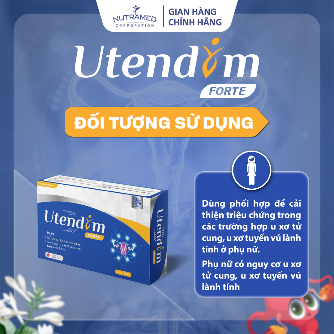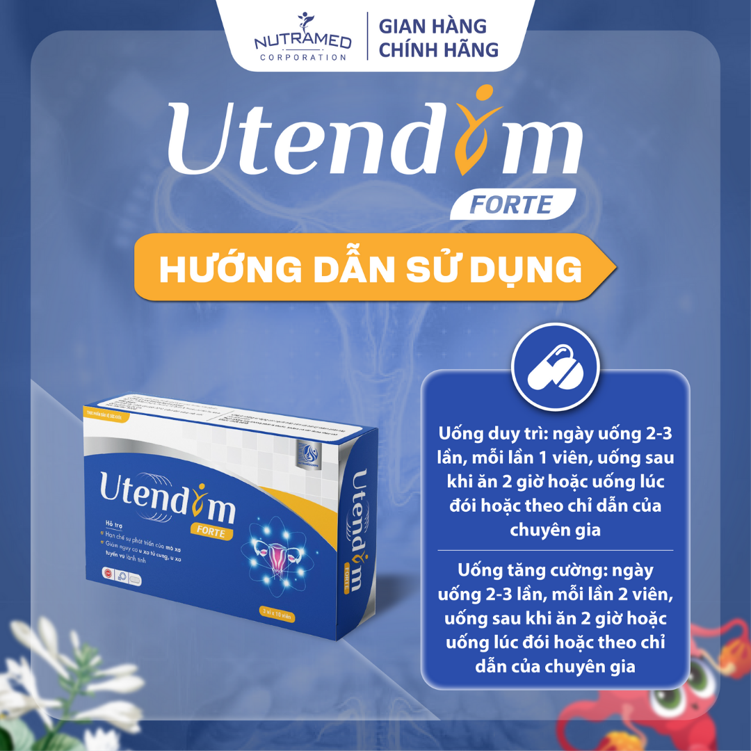 UTENDIM - Giúp giảm nguy cơ u xơ tử cung, u xơ tuyến vú   THÀNH PHẦN ️Chiết xuất Trinh nữ hoàng cung; Chiết xuất Quế; Chiết xuất Bạch thược; Chiết xuất mẫu đơn; Chiết xuất Bạch phục linh; Chiết xuất Trinh nữ - Chasteberry; Chiết xuất Bồ công anh   CÔNG DỤNG ️Hỗ trợ hạn chế sự phát triển của mô xơ, giúp cải thiện các biểu hiện và giảm nguy cơ u xơ tử cung, xu xơ tuyến vú lành tính ở phụ nữ   ĐỐI TƯỢNG SỬ DỤNG ️Dùng phối hợp để cải thiện triệu chứng của xu xơ tử cung, u xơ tuyến vú lành tính ở phụ nữ. Phụ nữ có nguy cơ u xơ tử cung, u xơ tuyến vú lành tính     HƯỚNG DẪN SỬ DỤNG ️ Uống duy trì: 1 viên/lần x 2-3 lần/ngày ️ Uống tăng cường: 2 viên/lần x 2-3 lần/ngày  ️ Uống sau khi ăn 2-3 giờ hoặc uống lúc đói hoặc theo chỉ dẫn của chuyên gia.   KHÔNG SỬ DỤNG TRONG TRƯỜNG HỢP ️Người mẫn cảm, kiêng kỵ với bất kỳ thành phần nào của sản phẩm.   LƯU Ý ️Sản phẩm này không phải là thuốc, không có tác dụng thay thế thuốc chữa bệnh.   BẢO QUẢN  ️Nơi khô mát, tránh ánh nắng trực tiếp. Nhiệt độ không quá  30°C. Tránh xa tầm tay trẻ nhỏ.   THÔNG TIN SẢN PHẨM Tên sản phẩm: Utendim forte Quy cách: Hộp 3 vỉ x 10 viên Hạn sử dụng: 36 tháng Tiêu chuẩn: TCCS   _ NUTRAMED - KHƠI NGUỒN KHOA HỌC TỚI CUỘC SỐNG   Nhà máy đạt chuẩn WHO – GMP. Nguyên liệu được kiểm tra chất lượng khắt khe bởi nhà máy đạt chuẩn GMP.