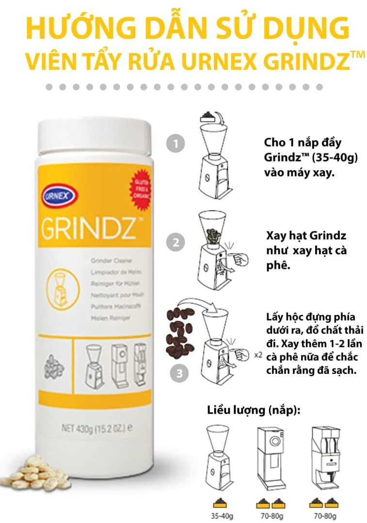 Giới thiệu Viên nén làm sạch máy xay Urnex GRINDZ – được pha chế từ tất cả các thành phần tự nhiên, có thể phân hủy sinh học và không chứa gluten giúp loại bỏ cặn