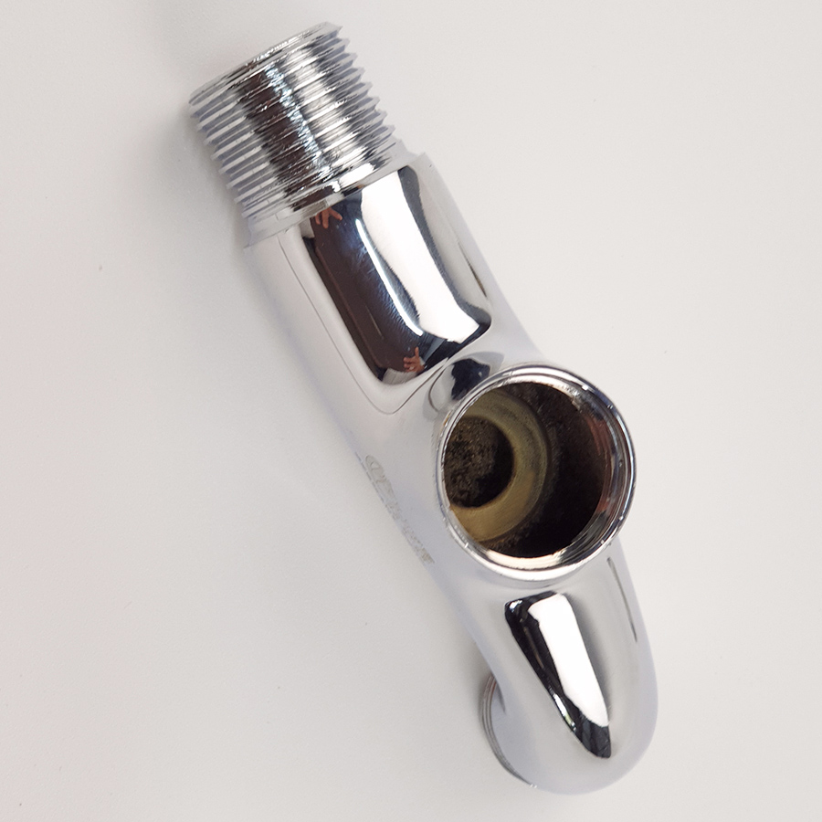 Van khóa chữ T chia hai đường nước 1 ngã cấp nước vào bồn cầu dây xịt vệ sinh, 1 ngã dùm để giảm áp lực nước Thân van được làm bằng đồng mạ chrome,