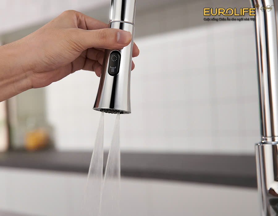 Vòi rửa chén nóng lạnh dây kéo 4 chức năng sử dụng Eurolife EL-IK01,02,03 (3 màu: trắng bạc, vàng, xám)