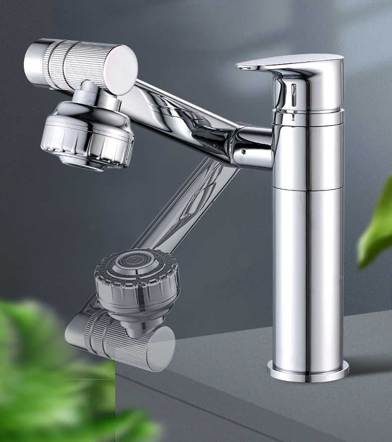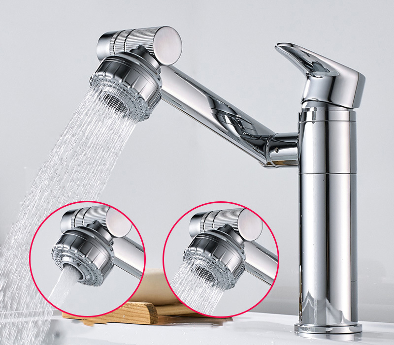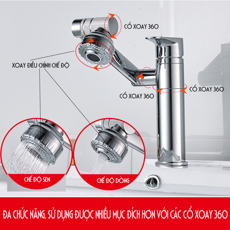 Vòi rửa mặt Lavabo cổ xoay 720 độ đa chiều, củ đồng, thân ngắn, mạ Crom, điều chỉnh nhiều chế độ tia nước Minh House