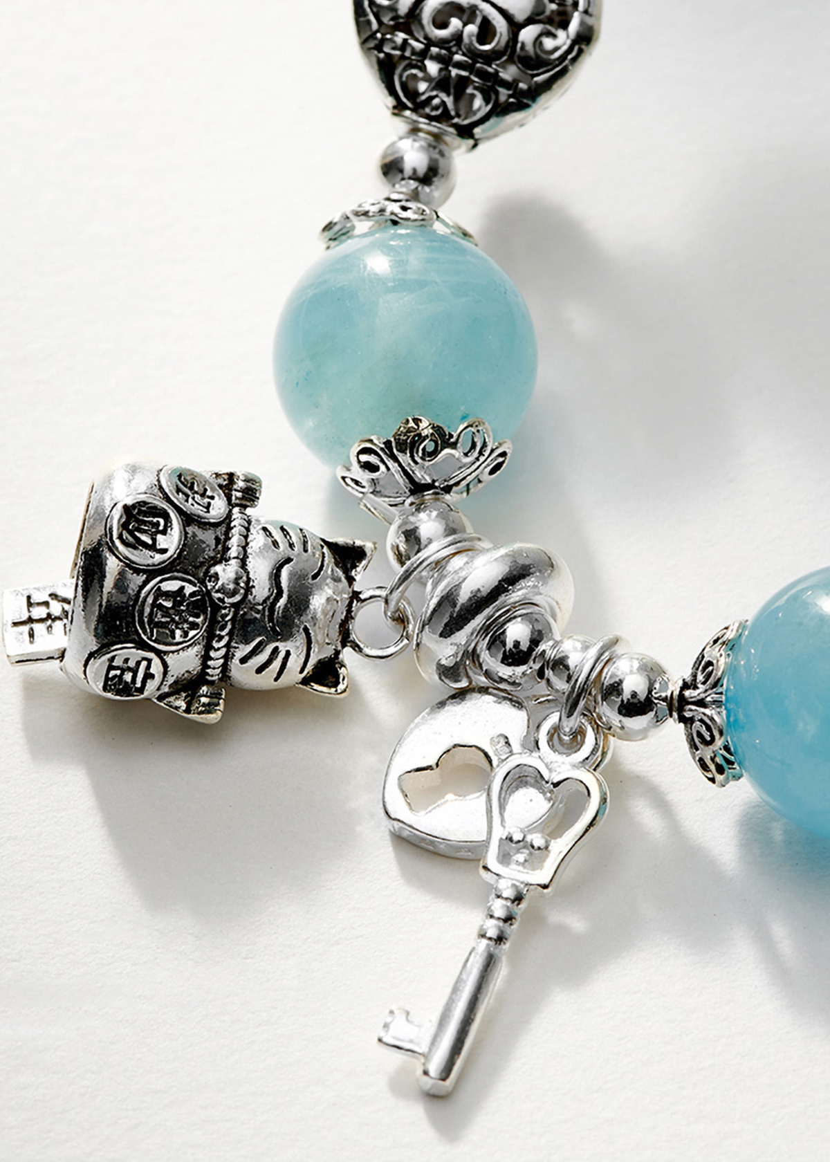 VÒNG TAY ĐÁ AQUAMARINE PHỐI CHARM MÈO BẠC: