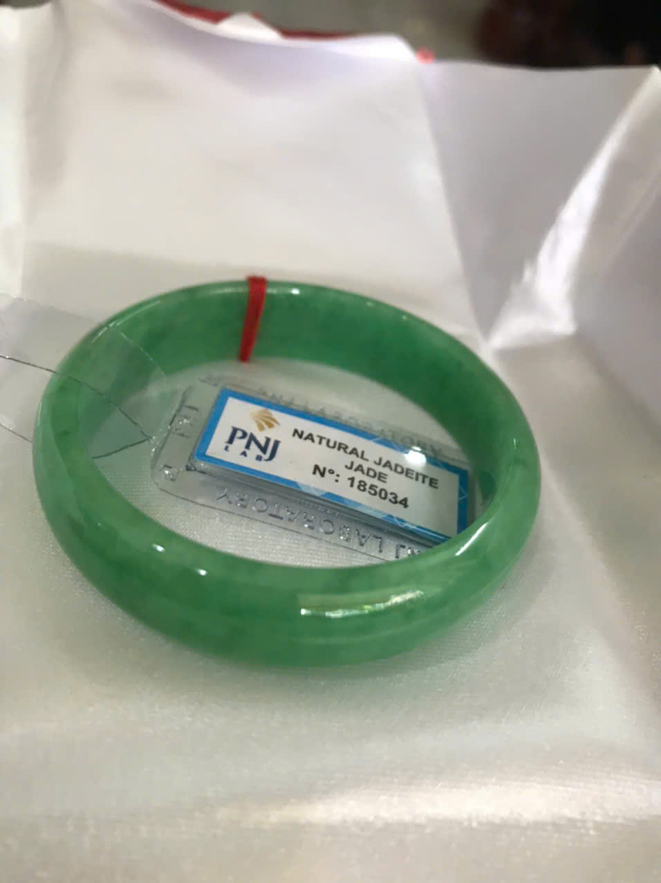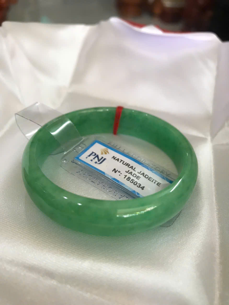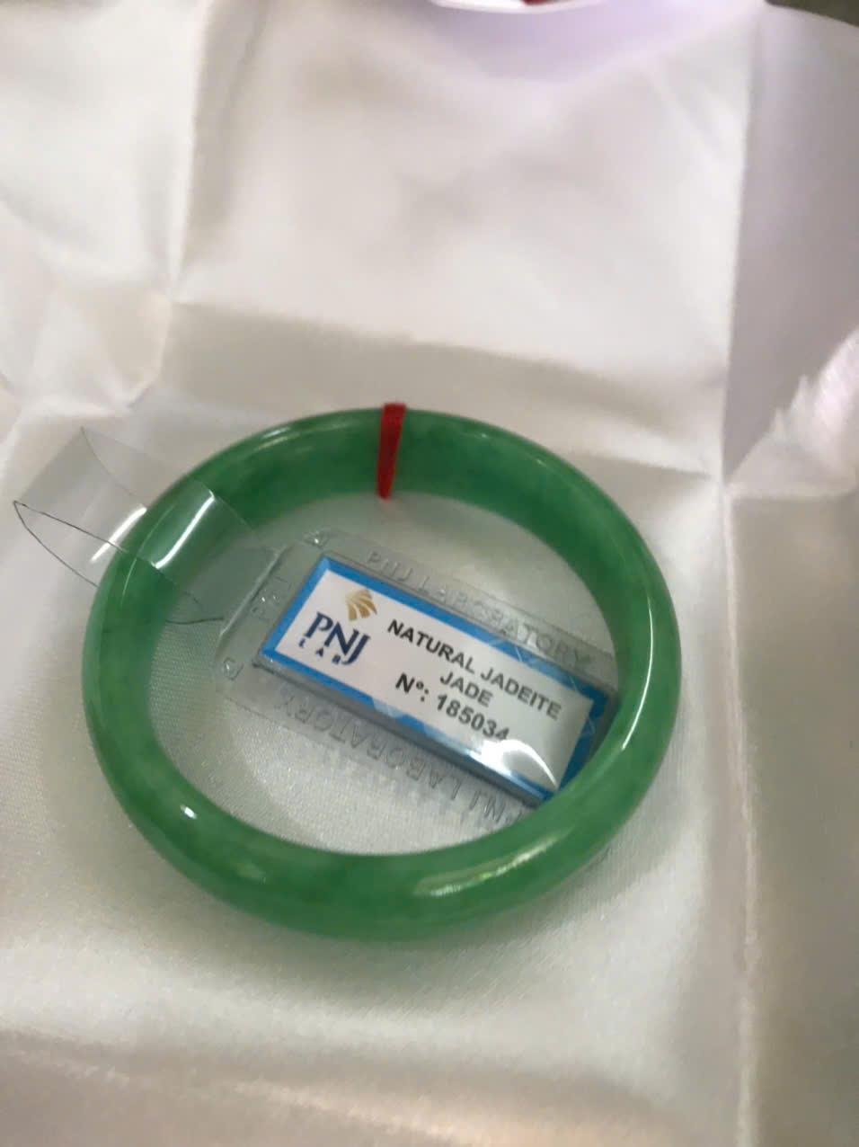 Vòng Tay Nữ Đá Ngọc Cẩm Thạch Tự Nhiên Bản Hẹ Sịn Đậu Lý Sao Ni 48mm Cao 12mm Dầy 6mm đã kiểm định kèm giấy chứng nhận P No 185034 Màu Xanh ngọc lý tươi bóng đều đẹp nữ tay nhỏ 35kg - 48kg ạ