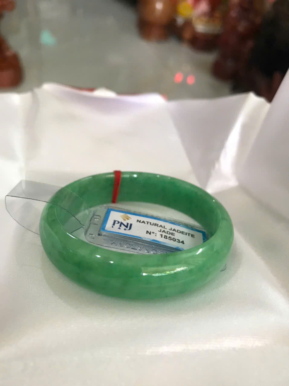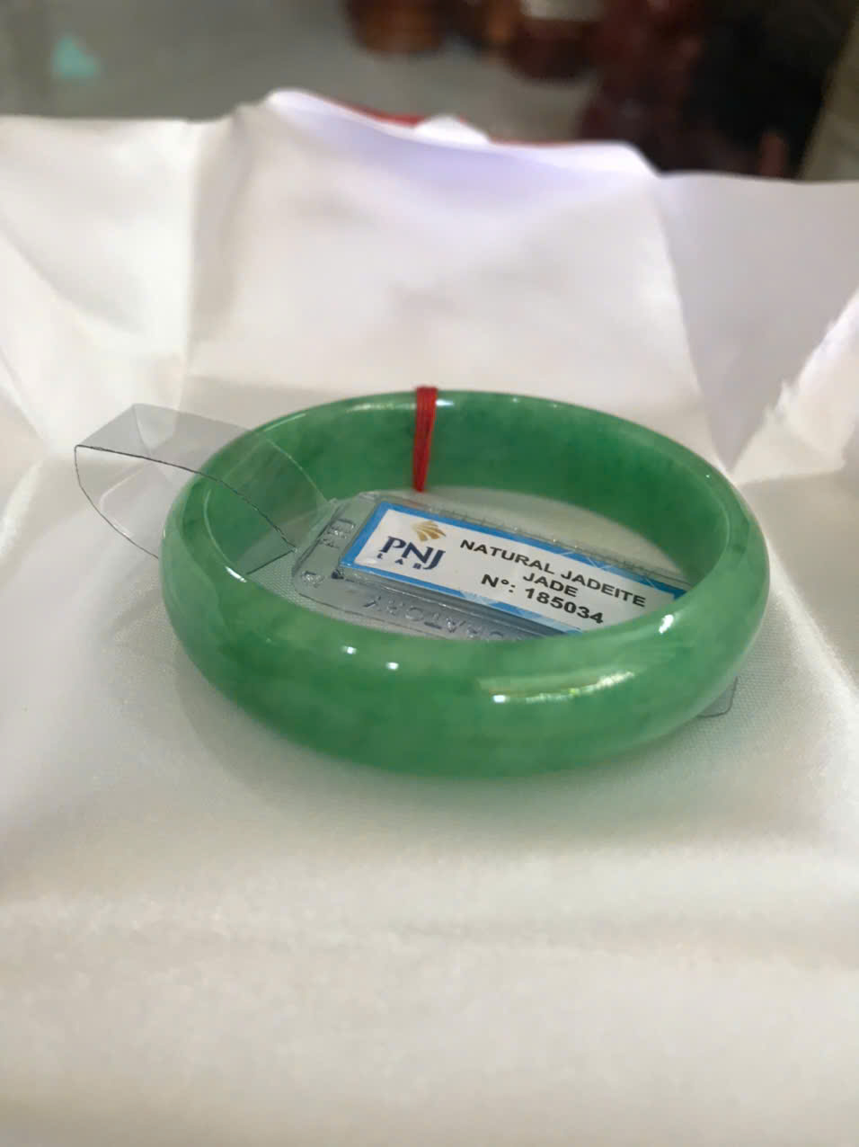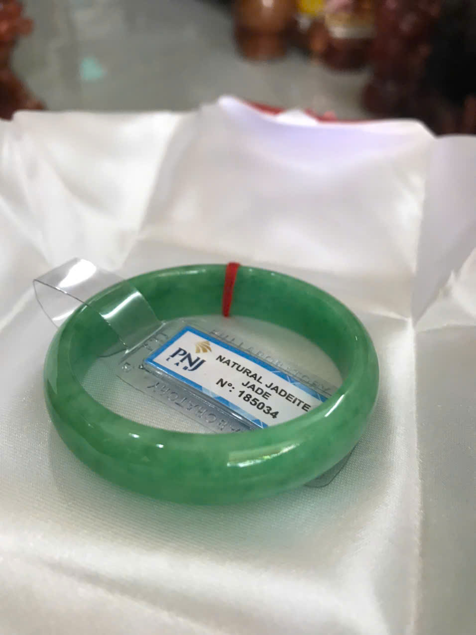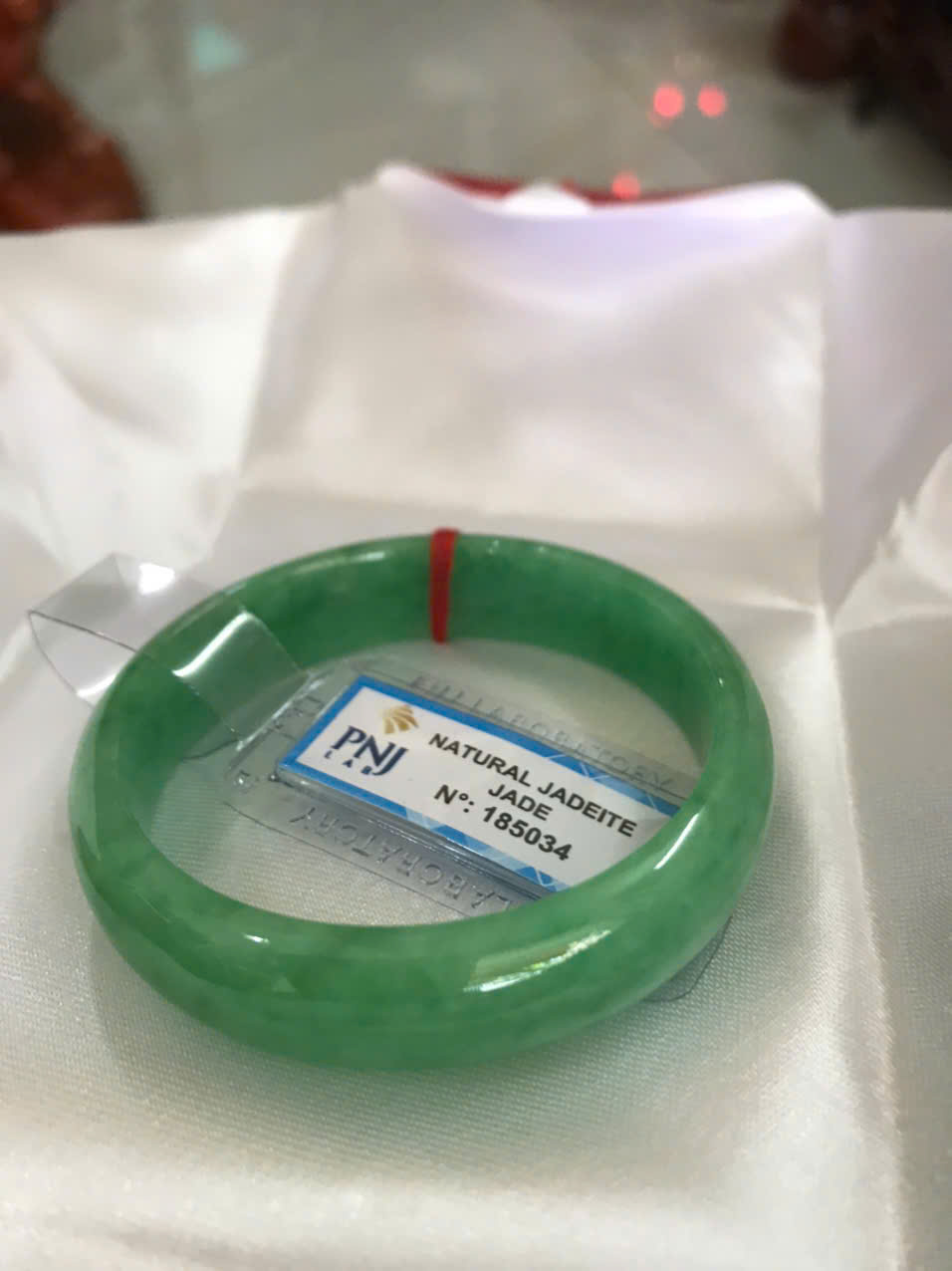 Vòng Tay Nữ Đá Ngọc Cẩm Thạch Tự Nhiên Bản Hẹ Sịn Đậu Lý Sao Ni 48mm Cao 12mm Dầy 6mm đã kiểm định kèm giấy chứng nhận P No 185034 Màu Xanh ngọc lý tươi bóng đều đẹp nữ tay nhỏ 35kg - 48kg ạ