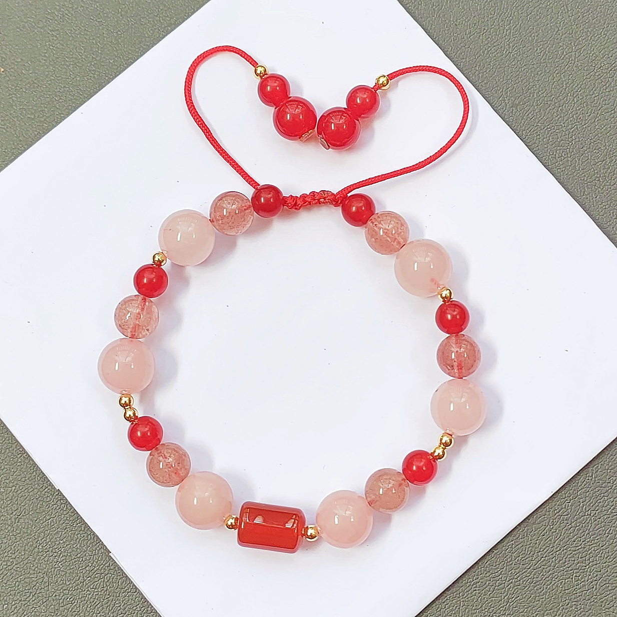 • Chất liệu: đá thạch anh hồng 10mm, đá thạch anh dâu 8mm, đá thạch anh đỏ 6mm, lu thống đá thạch anh đỏ 13mm x 8mm và bi bạc tròn.