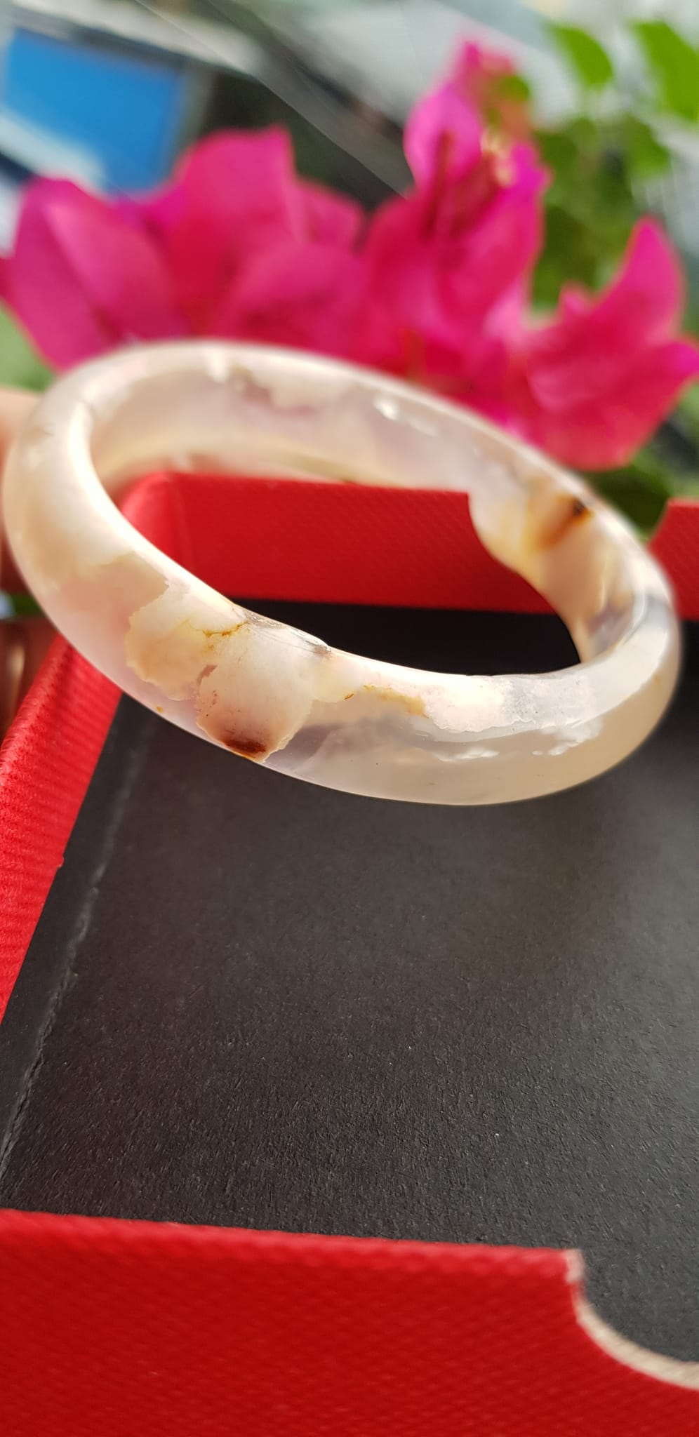 Vòng tay phong thuỷ Nữ Bản Hẹ Đá Mã Não trắng vàng nhẹ bông hoa bóng đẹp Vòng tay Nữ Ni 48mm x Cao 11mm x dầy 6mm Nữ tay nhỏ cân nặng 30kg -