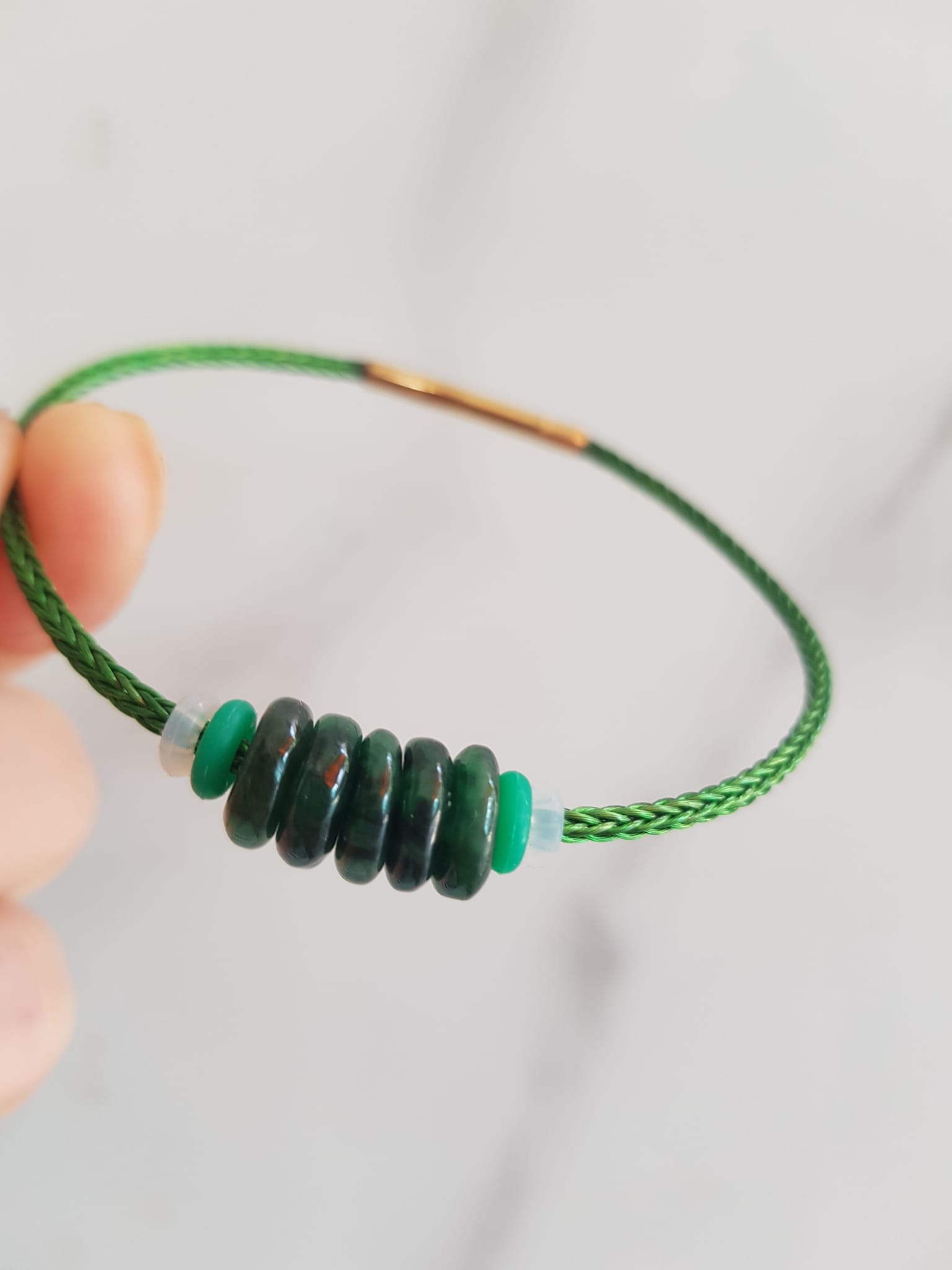 ✨Vòng tay phong thủy nữ charm kiểu 5 đồng tiền Xanh Đậm dây xanh may mắn Đá cẩm thạch tự nhiên xanh đậm đẹp phối dây màu xan có khoen chắc chắn Hợp nữ mệnh thủy mộc hỏa ạ