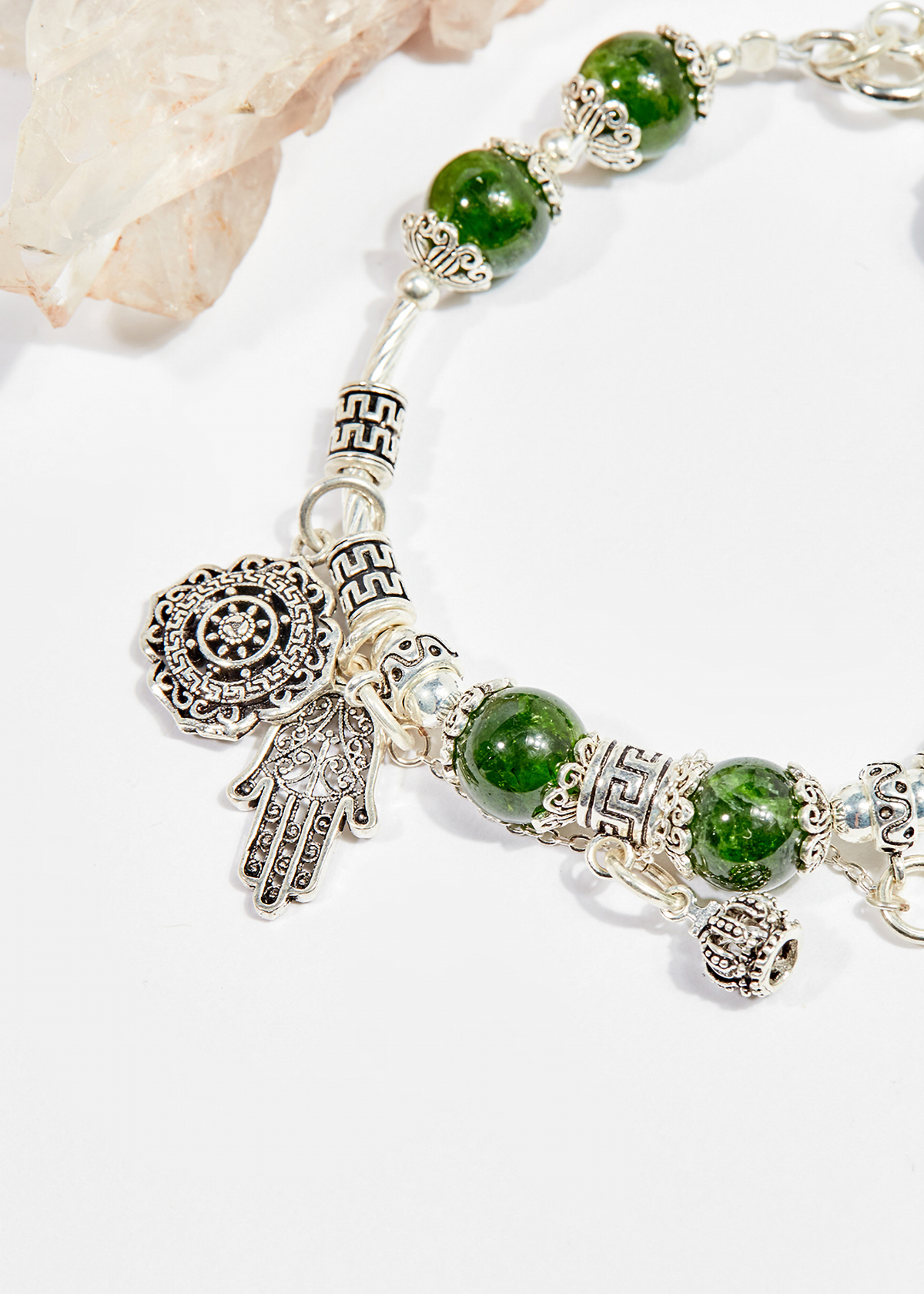 VÒNG TAY ĐÁ THẠCH ANH ƯU LINH TRẮNG CHARM CỎ: Thật không ngoa khi nói rằng Thạch Anh Ưu Linh Trắng có khả năng thu hút mọi ánh nhìn bởi vẻ đẹp tươi sáng, độc