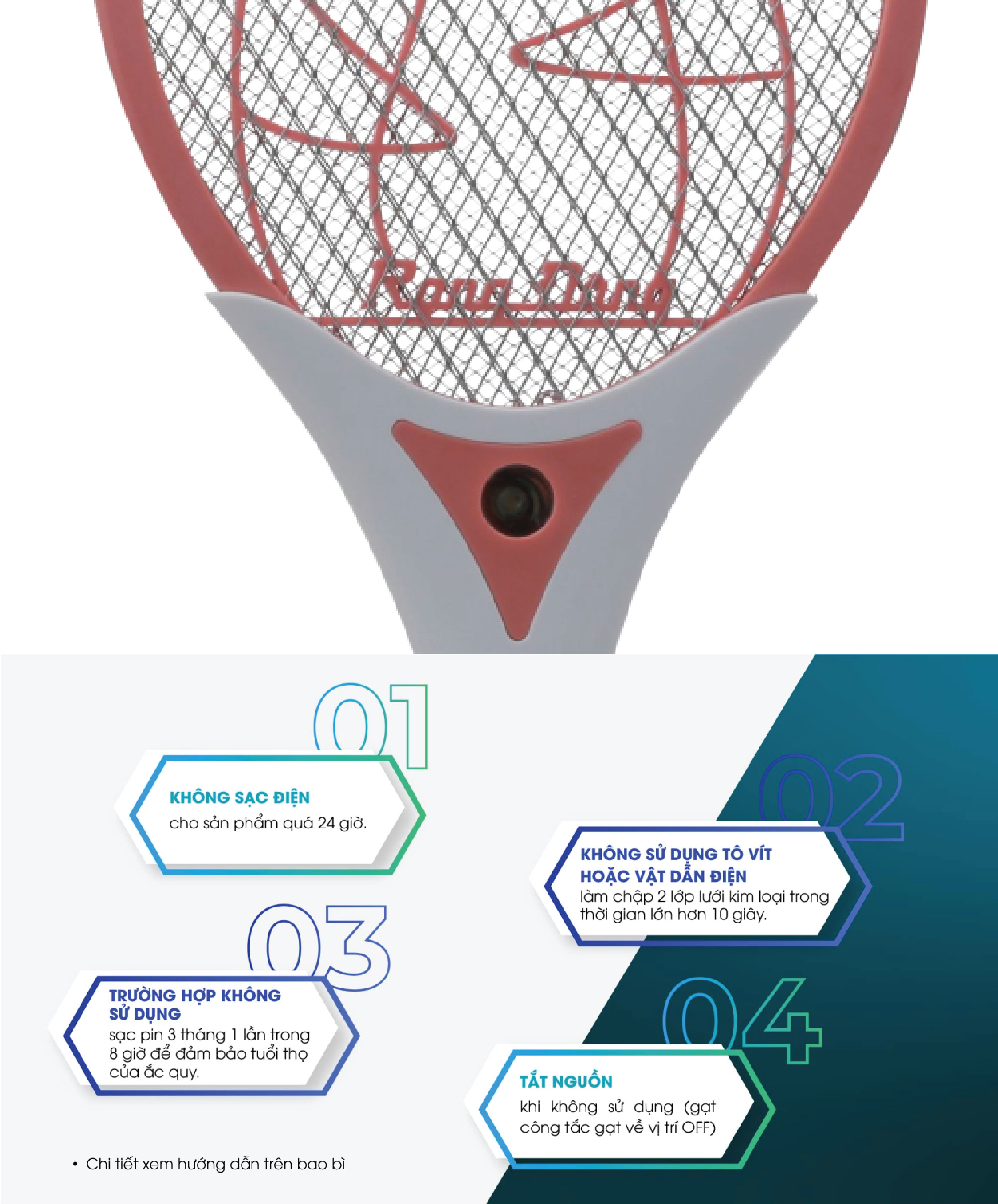 ĐẶC ĐIỂM NỔI BẬT- 3 lớp lưới giúp tiêu diệt muỗi nhanh chóng- Tích hợp đèn LED và đèn báo sạc tiện dụng- Nhựa ABS an toàn, chịu va đập- Tay cầm chống trượt- Tự