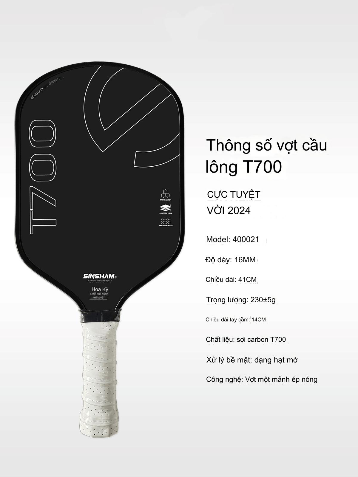 Màu sắc: Xám - Đỏ - Dài: 415 mm - Rộng: 195 mm - Độ dày: 16mm. - Trọng lượng: 235g - Cấu tạo: Lõi tổ ong, mặt carbon T700. - Vợt Pickleball T700 Pro được sản xuất theo tiêu chuẩn USSA  Mặt vợt carbon T700 Pro 16mm - Phù hợp lối chơi kiểm soát bóng. Nên dùng đối với những người có lối đánh cân bằng, kết hợp