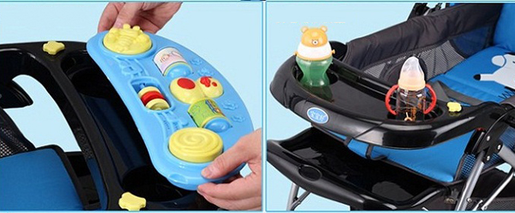 • Lưng tựa của xe có 3 nấc điều chỉnh cho em bé nằm, ngả, ngồi thoải mái, phía trước có khay để đồ cho bé kết hợp làm vòng bảo hiểm rất tiện dụng, tay đẩy của xe, đẩy được hai chiều phía trước và phía sau.