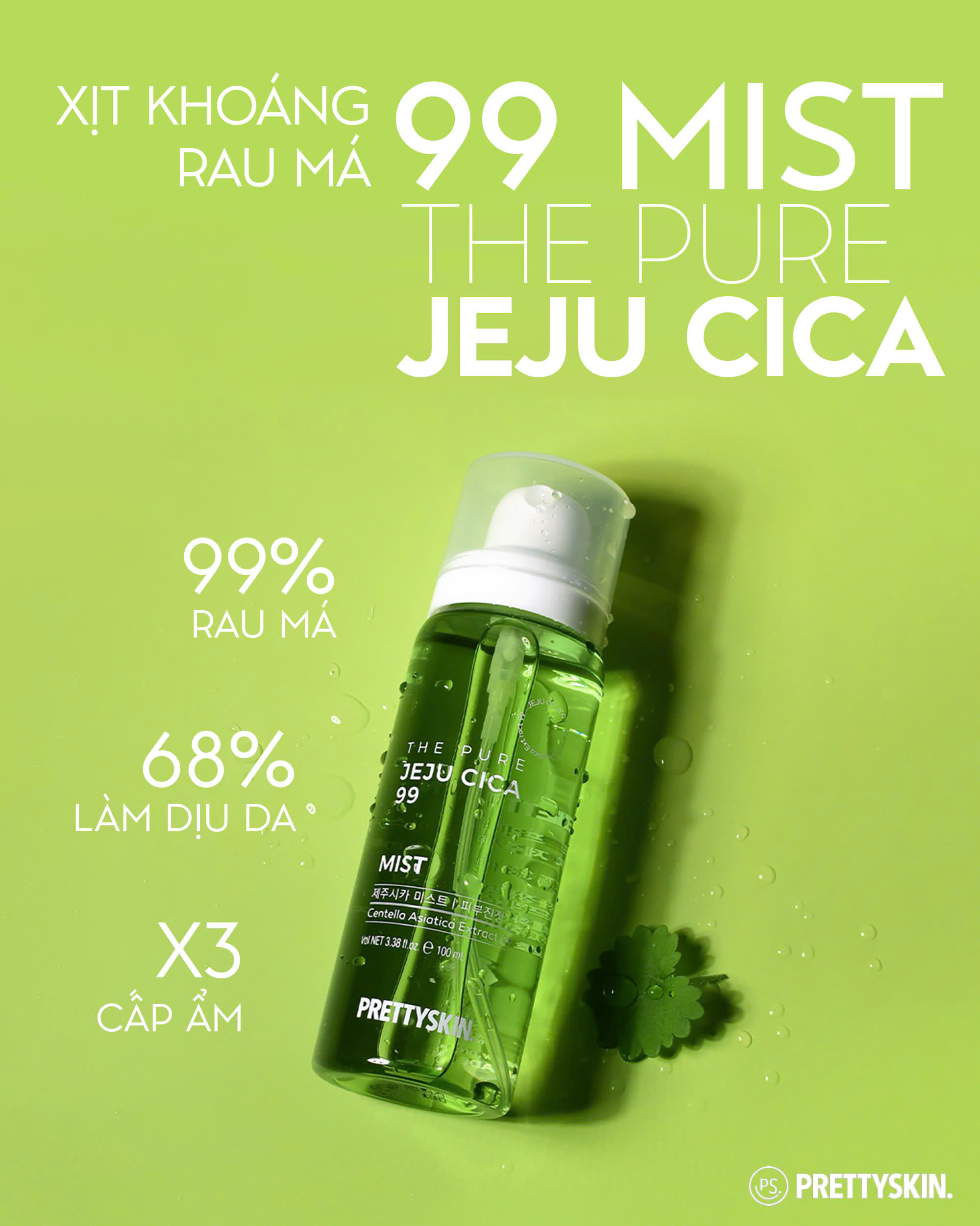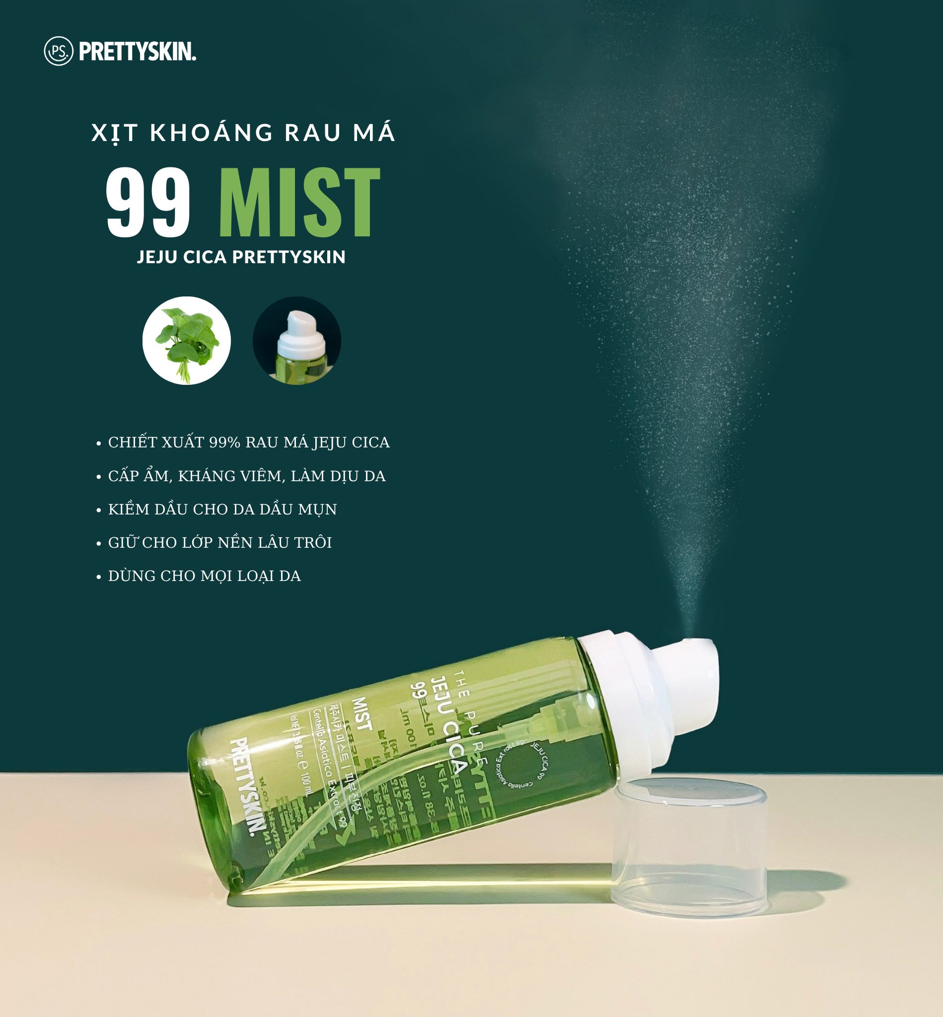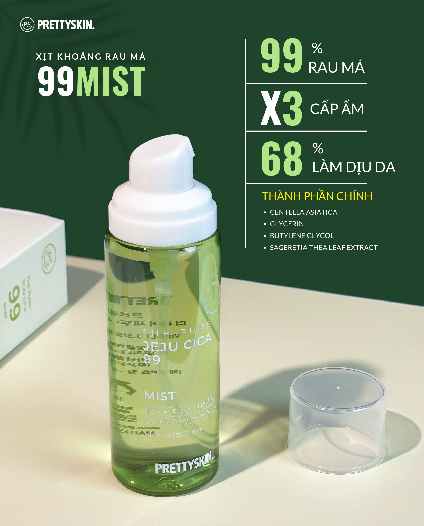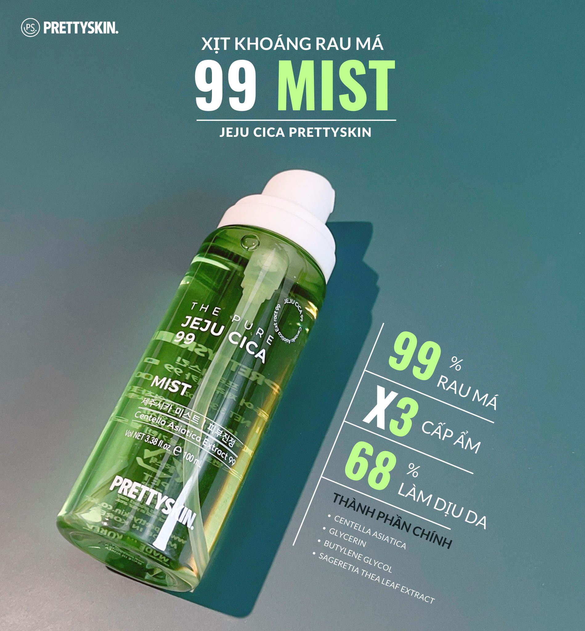 Mua tại TiktokXịt khoáng rau má Pretty Skin The Pure Jeju Cica 99 Mist làm dịu cấp ẩm cho da Xuất xứ: Hàn Quốc. Thương Hiệu: Prettyskin. Dung tích: 100ml. Phù hợp: Mọi loại da, đặc biệt da dầu, mụn CÔNG DỤNG VÀ THÀNH PHẦN