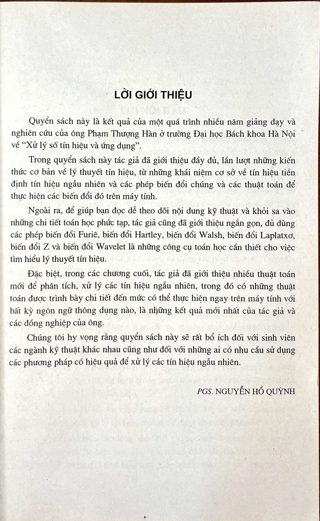 "Xử lý số tín hiệu và ứng dụng" Được biên soạn để giúp bạn đọc dễ theo dõi nội dung kỹ thuật và khỏi sa vào những chi tiết toán học phức tạp, tác giả cũng đã giới thiệu ngắn gọn đủ dung các phép biến đổi Furie, biến đổi Hartley, biến đổi Walsh, biến đổi Laplatxo, biến đổi Z và biến đổi Wavelet là những công cụ toán học cần thiết cho việc tìm hiểu lý thuyết tín hiệu.