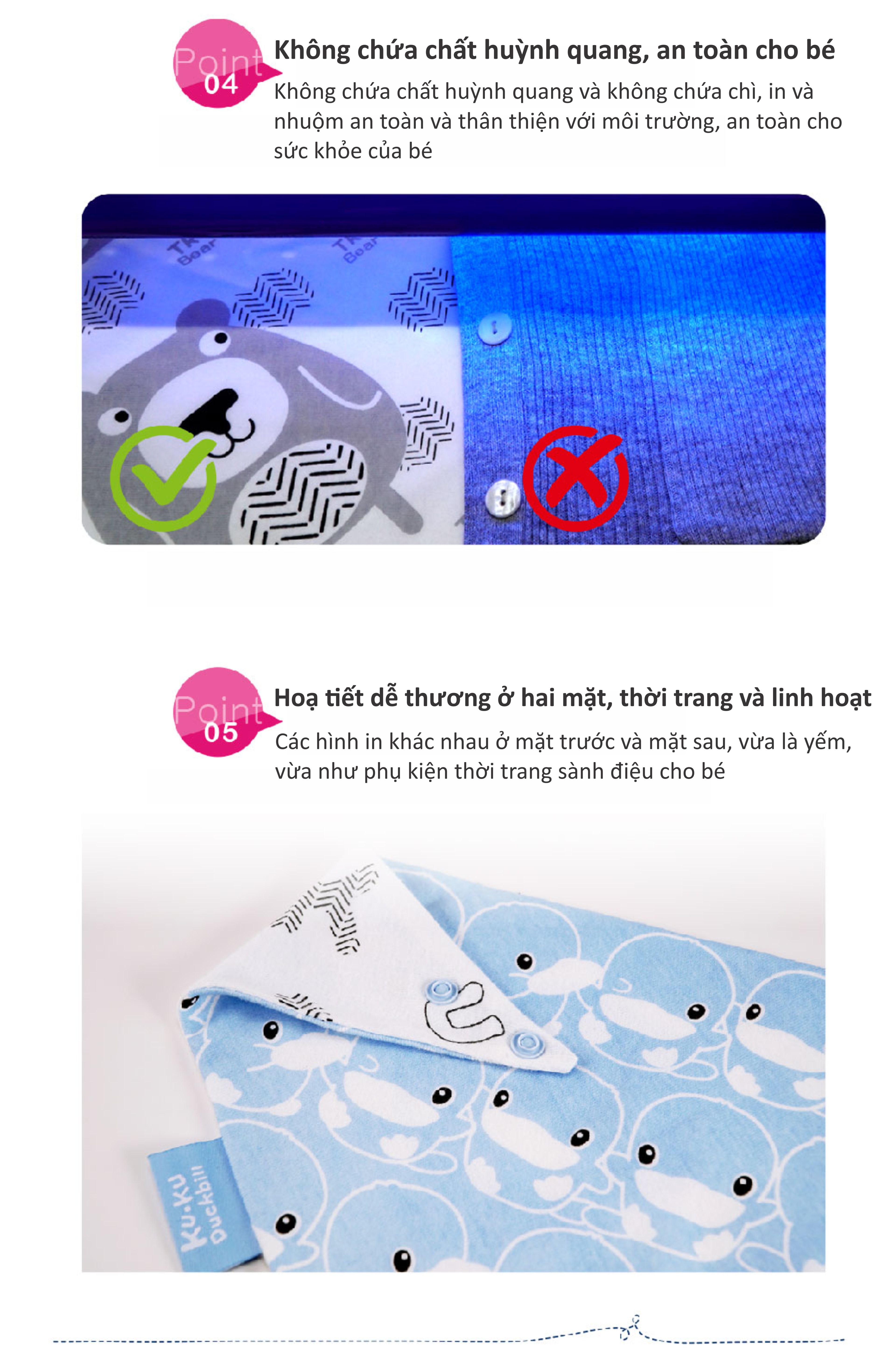 Yếm Ăn Cho Bé KuKu KU2227 thiết kế gài băng dán ở bên phải vai của bé. Bề mặt yếm in hình thú mỏ vịt Kuku đang hồn nhiên chơi đùa tạo sự hứng thú cho