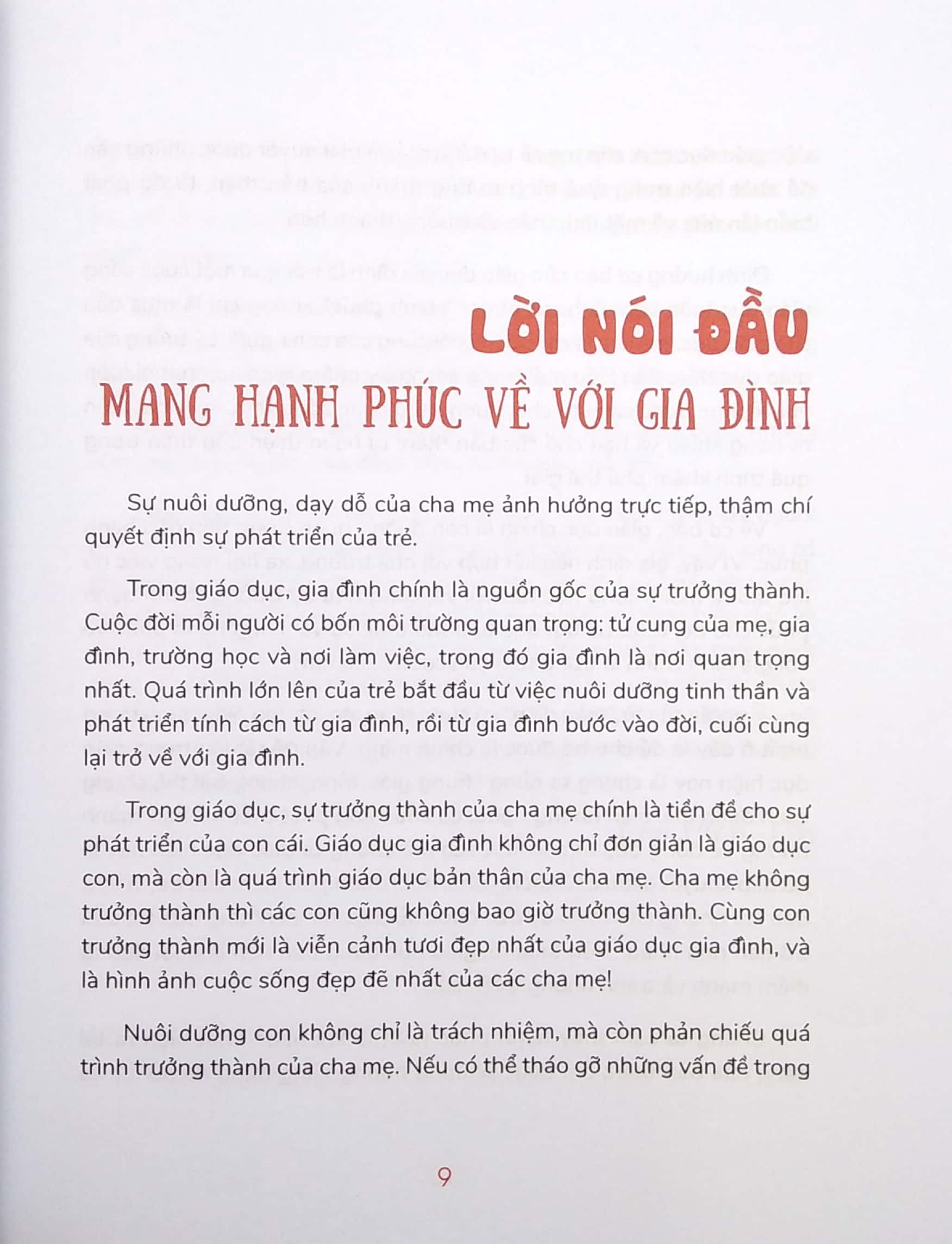 Trong giáo dục, gia đình chính là nguồn gốc của sự trưởng thành. Cuộc đời mỗi người có bốn môi trường quan trọng: tử cung của mẹ, gia đình, trường học và nơi làm việc, trong đó gia đình là nơi quan trọng nhất. Quá trình lớn lên của trẻ bắt đầu từ việc nuôi dưỡng tinh thần và phát triển tính cách từ gia đình, rồi từ gia đình bước vào đời, cuối cùng lại trở về với gia đình.