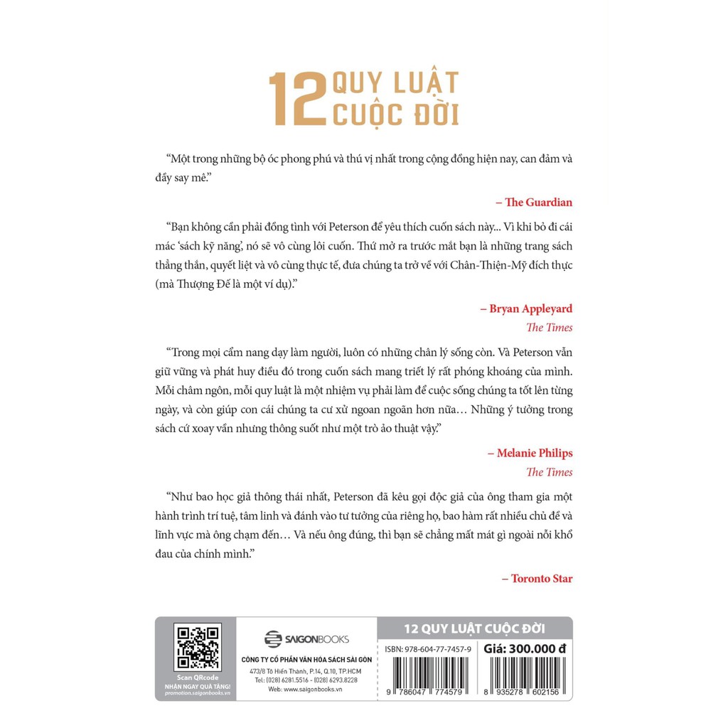 12 QUY LUẬT CUỘC ĐỜI: “THẦN DƯỢC” NÀO CHO CUỘC SỐNG CỦA CHÚNG TA? Nếu được hỏi chính mình một câu thật thẳng thắn thì chắc chắn chúng ta sẽ muốn bắt đầu bằng câu hỏi này: “Tại sao cuộc sống lại xấu xa, nặng nề và mệt mỏi đến thế?” Chẳng phải là mọi lúc, mọi nơi, nhưng đấy là câu hỏi vẫn đeo đẳng mỗi chúng ta; có lúc nó như động cơ thôi thúc chúng ta sống, sống để tìm ra câu trả lời cuối cùng; có lúc nó như hòn đá tảng cản đường, như muốn lấy nốt đi của chúng ta chút ý chí cuối cùng, khiến chúng ta muốn hủy hoại cuộc sống của mình. Cứ thế cho đến tận cùng. “Mọi người đều hành động như thể nỗi đau của họ là có thật – để rồi sau cùng nó là thật. Nỗi đau quan trọng hơn cả những vấn đề vật chất.” Có cách nào không, để mỗi chúng ta tìm thấy được ý nghĩa của cuộc sống và vượt qua được những xấu xa, nặng nề và mệt mỏi của nó mà sống một cuộc đời an vui? Rất nhiều người đi tìm câu trả lời, tìm trong triết học, tìm trong khoa học, tìm trong văn chương và nghệ thuật; và cho dù đã có rất nhiều câu trả lời được công bố bằng cách này hay cách khác, thì dường như điểm chung của chúng đều nằm ở kết luận rằng: Chúng ta mệt mỏi với cuộc sống là vì đã sống sai ở đâu đó; để tốt đẹp và thoải mái hơn, hãy biết tuân theo các quy luật! “12 Quy luật cuộc đời: Thần dược cho cuộc sống hiện đại” của Jordan B. Peterson đem đến cho người đọc 12 nguyên lý mà tác giả cho là phép màu giữa cuộc sống đầy hỗn độn hiện nay. Việc hiểu được thế giới đã từng như thế nào, hiện nay đang ra sao và ngày mai có thay đổi gì hoàn toàn không phải là mục đích, mà chỉ là phương tiện; mục đích là biết phải ứng xử thế nào trước thế giới ấy. Các quy luật của Jordan Peterson sẽ dẫn dắt bạn đi trên con đường tìm ra các lựa chọn ứng xử phù hợp nhất.