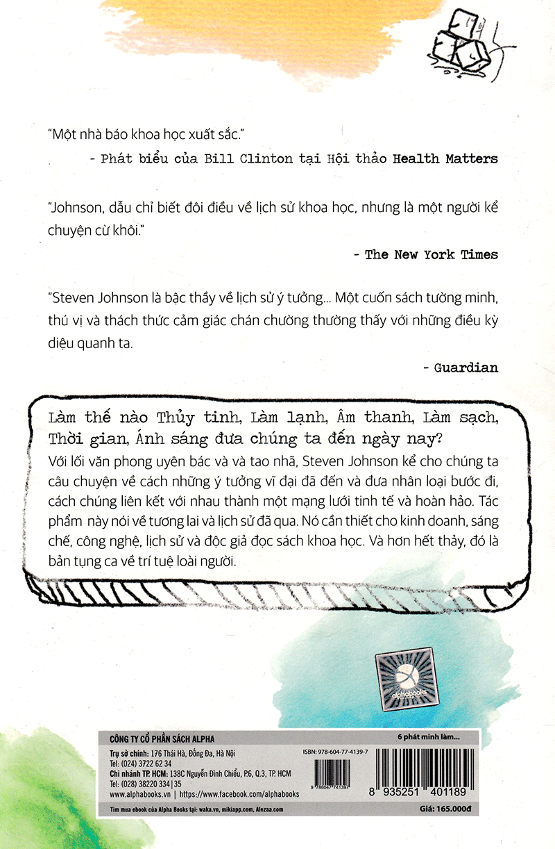 6 Phát Minh Làm Nên Thời Đại Steven Johnson đích thực là chuyên gia bậc thầy của lịch sử ý tưởng. Trong cuốn sách này, ông chỉ tập trung vào sáu công nghệ và khám phá các phân nhánh của chúng, cả mặt tốt lẫn không tốt. Ông đã tạo ra biểu trưng hình ảnh chim ruồi cho các loại hình phát minh mà mình quan tâm: sự đồng tiến hóa của hoa và côn trùng – kẻ không mời từ một trật tự sáng tạo khác. Cuốn sách này là tập hợp đầy đủ những “phát minh chim ruồi” hoàn toàn bất ngờ. Sáu chủ đề được đưa ra là: Thủy tinh, Làm lạnh, Âm thanh, Làm sạch, Thời gian, Ánh sáng. Có những câu chuyện nhà phát minh không nhận ra phạm vi thực sự khám phá của mình, như Édouard-Léon Scott de Martinville, người vào năm 1850 đã phát minh ra máy ký âm nhưng không có thiết bị phát lại. Ông tin rằng, ngày nào đó chúng ta sẽ giải mật chúng như cách đọc nốt nhạc. Máy quét sóng siêu âm được phát triển dựa trên thiết bị tìm kiếm tàu đắm Titanic. Nhiều năm sau, công nghệ lại kết hợp với chính sách một con của Trung Quốc để tạo thành sự mất cân bằng giới tính khốc liệt trong xã hội trọng nam. Các chủ đề và hướng tiếp cận của Johnson được lựa chọn đều gây sự khâm phục đáng kinh ngạc. Một trong số đó là chuyện vào thập niên 1850, 1860, cả thành phố Chicago được nâng lên bằng kích vít để đặt hệ thống ống cống ngầm. Phương pháp mạnh bạo này vô cùng cần thiết vì Chicago rất phẳng; không có độ dốc tự nhiên để thoát nước và thành phố, trung tâm buôn bán thịt náo nhiệt miền trung tây, điều táo bạo cần thiết để giải vây thành phố khỏi rác thải độc hại. Chicago một lần nữa lại xuất hiện ở chương “Làm lạnh”: đó là đường ô tô ray cho xe đông lạnh chờ thịt từ đồng bằng đi khắp nước Mỹ. Johnson nhấn mạnh rằng nhiều phát minh không phải là kết quả của “phút Eureka” mà là sự chín muồi của một tiến trình dài bao gồm một mạng lưới các nhà phát minh và doanh nghiệp. Ông đã cố xoay xở và cuối cùng đã tìm ra cách định nghĩa khoảnh khắc này. Dữ liệu số được truyền dẫn lần đầu tiên năm 1943 qua một đường dây mật SIGSALYY được Alan Turing và Phòng thí nghiệm Bell phát triển: Turing là một nhà sáng chế thiên tài. Đây là một cuốn sách ngắn, khá dễ đọc, thú vị và đầy thách thức với những điều kỳ diệu mỗi ngày quanh ta .