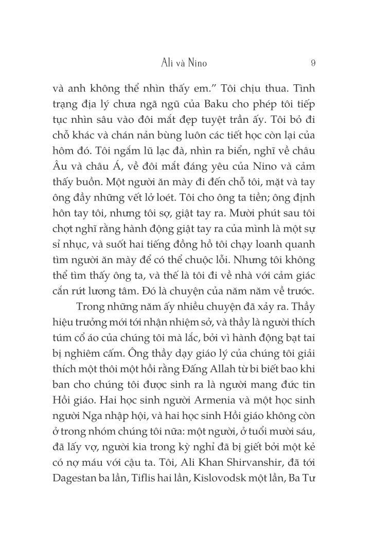 Hẳn nhiều người sẽ đoán, bằng vào cái tên, rằng đây là một câu chuyện tình. Phải, Ali và Nino: mối tình thanh mai trúc mã giữa hai cô cậu học trò nơi thành Baku cổ kính của đất nước Azerbaijan. Ali và Nino: đôi tình nhân ngang trái bị ràng buộc bởi hai tôn giáo, hai sắc tộc, chỉ có thể đến với nhau bằng cách trả những món nợ máu.