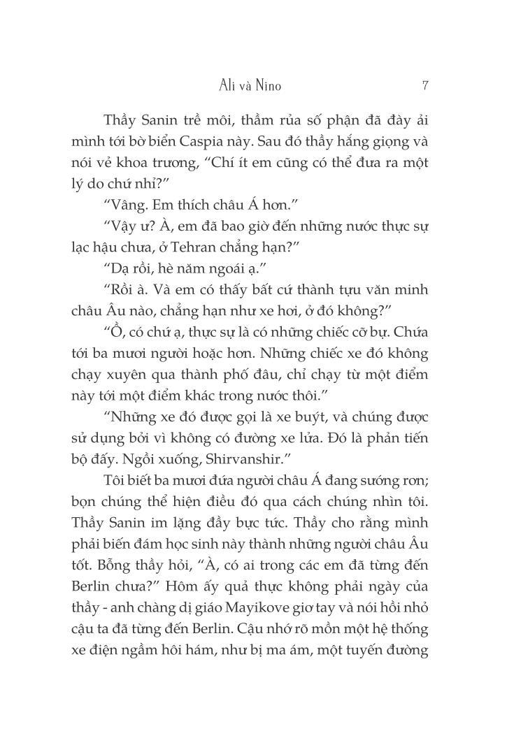 Nhưng, Ali và Nino không chỉ là một câu chuyện tình. Bằng giọng kể Nghìn lẻ một đêm, nó cuốn ta đi lên rừng, xuống biển, bằng sa mạc, rù quến ta trong những vẻ đẹp nên thơ và những bí ẩn gợi hoặc của miền đất giao thoa giữa Đông và Tây. Với tầm vóc sử thi, nó lại nhấn chìm ta trong bóng đen của cuộc Thế chiến thứ nhất, khi mối đe dọa chiến tranh bắt đầu xé toạc những lỗ hổng trong cái cộng đồng đa văn hóa, đa sắc tộc từ hàng bao thế kỷ, buộc những cư dân bất kể tôn giáo phải đưa ra lựa chọn: hướng về phương Tây với những biến đổi hiện đại chóng mặt, hay bám giữ lấy phương Đông của tinh thần, của thi ca, của truyền thống hàng trăm thế hệ. Để rồi cuối cùng, nó lại đưa ta trở về với thiên tình sử nồng nàn và bi thương, một nốt trầm lặng da diết khiến Ali và Nino trở nên một kiệt tác bất diệt như những đụn cát sa mạc.