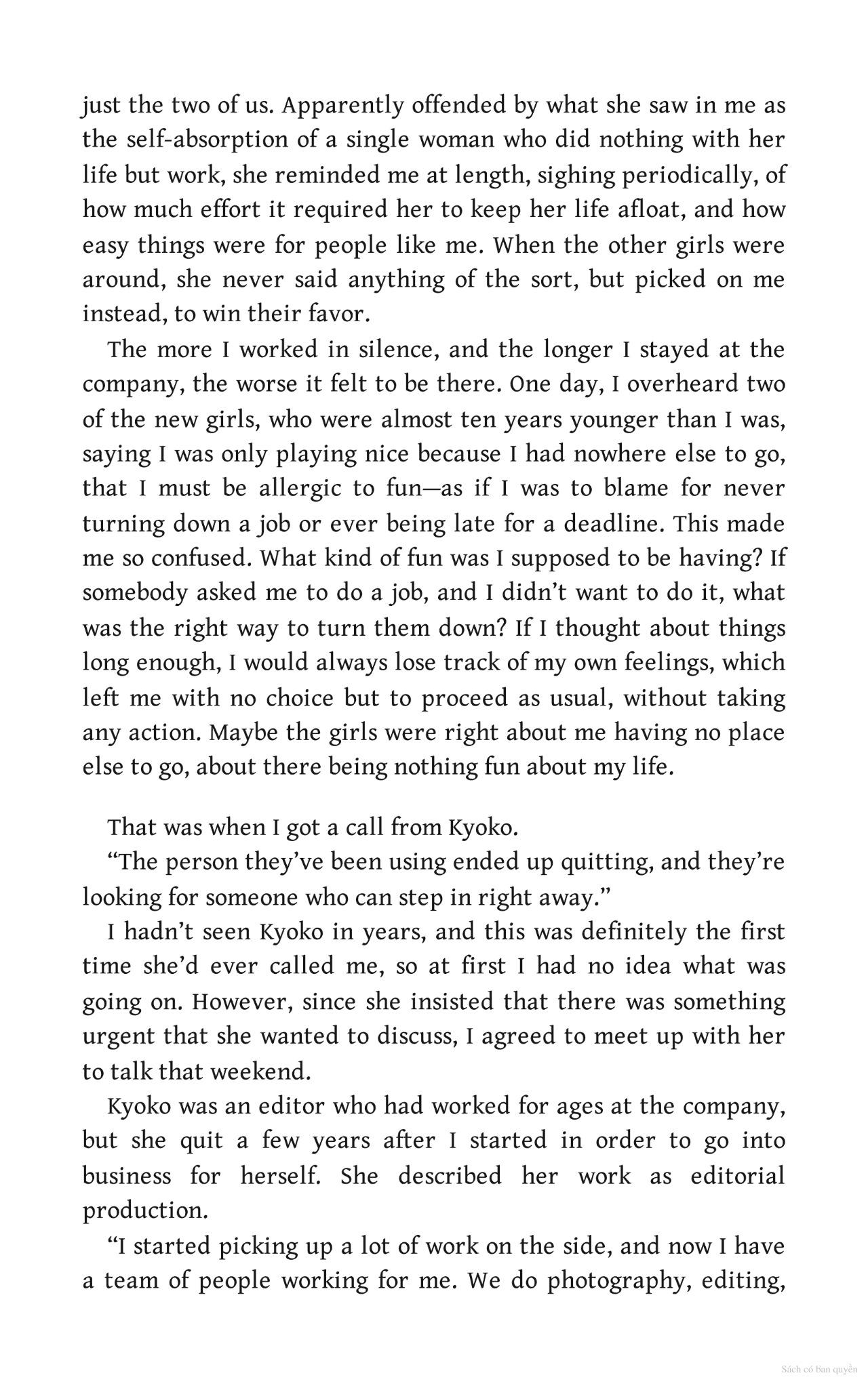 Fuyuko Irie is a freelance proofreader in her thirties. Living alone in an overwhelming city and unable to form meaningful relationships, she has little contact with anyone other than her colleague, Hijiri. But a chance encounter with a man named Mitsutsuka awakens something new in her. Through their weekly meetings, Fuyuko starts to see the world in a different light and still, painful memories from her past begin to resurface.