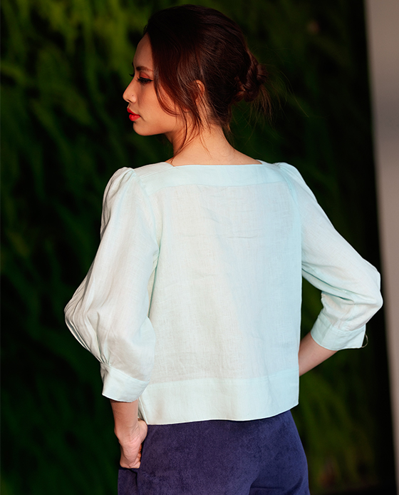Áo Croptop Linen Aqua TOP132 Thời trang thiết kế HityKiểu dáng áo suông rộng ngắn ngang lưng quần croptopCổ vuôngTay phồng nhún vaiCài bằng hàng nút phía trướcCHẤT LIỆULinenNút vò sò xanh tự n...