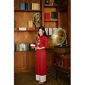 Áo dài form suông đỏ đô may bằng chất liệu lụa gấm loại 1 kết hoa và chim, tay lỡ loe, quần lụa hồng nhạt