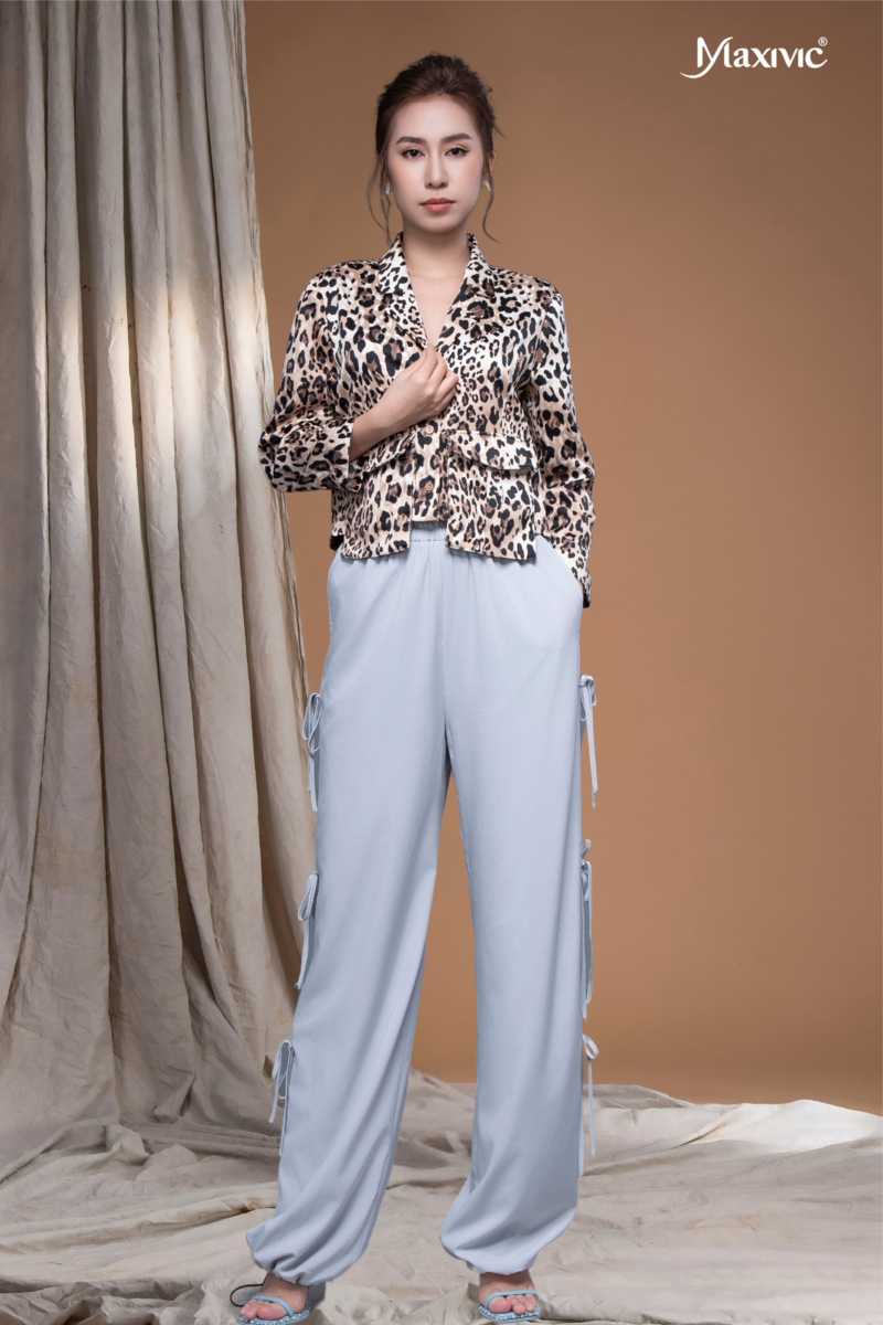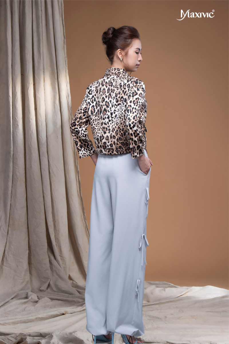 Áo sơ mi La Mộc họa tiết da beo thể hiện được nữ quyền. Thiết kế tay lỡ phồng và nhún nhẹ mang đến cảm giác thanh lịch cho nàng. Thiết kế với sự chỉnh