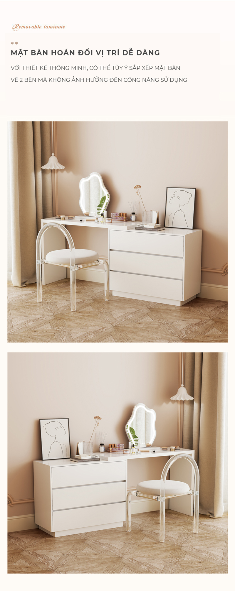 * Bàn trang điểm nhỏ gọn, đa năng - Bàn phấn trang điểm nhỏ gọn, đa năng với thiết kế đơn giản, các chi tiết hạn chế tối đa sự cầu kỳ, phức tạp