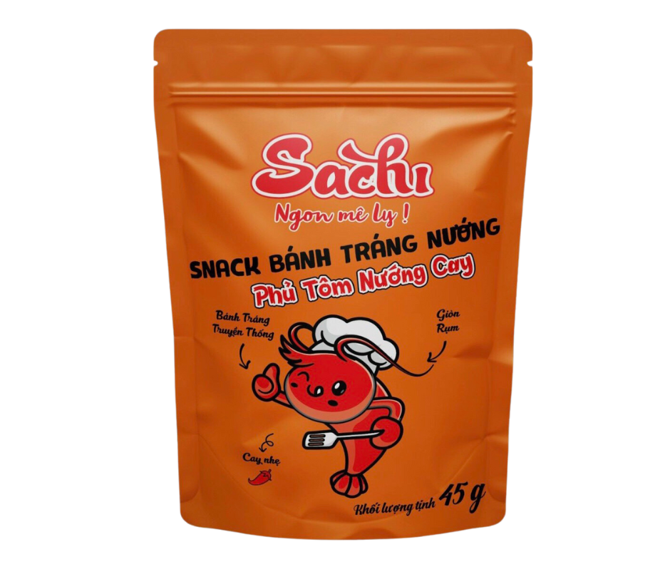 Sản phẩm bánh tráng dừa nướng tẩm khô bò, phô mai, chà bông gà, khô mực, tôm tẩm, rong biển của Sachi với các thành phần chính là bánh tráng dừa, nguyên liệu và nhờ
